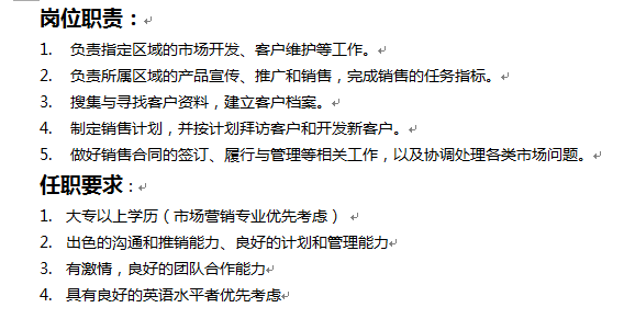 一般情况下,我们会在相关前面加上几个字“XX相关经历”,这个XX是怎么定的,基本上是由招聘信息的岗位职责和任职要求,外加你自身的情况来确定的。以下面某公司在招聘销售代表时发布的信息为例,我们逐条来分析。