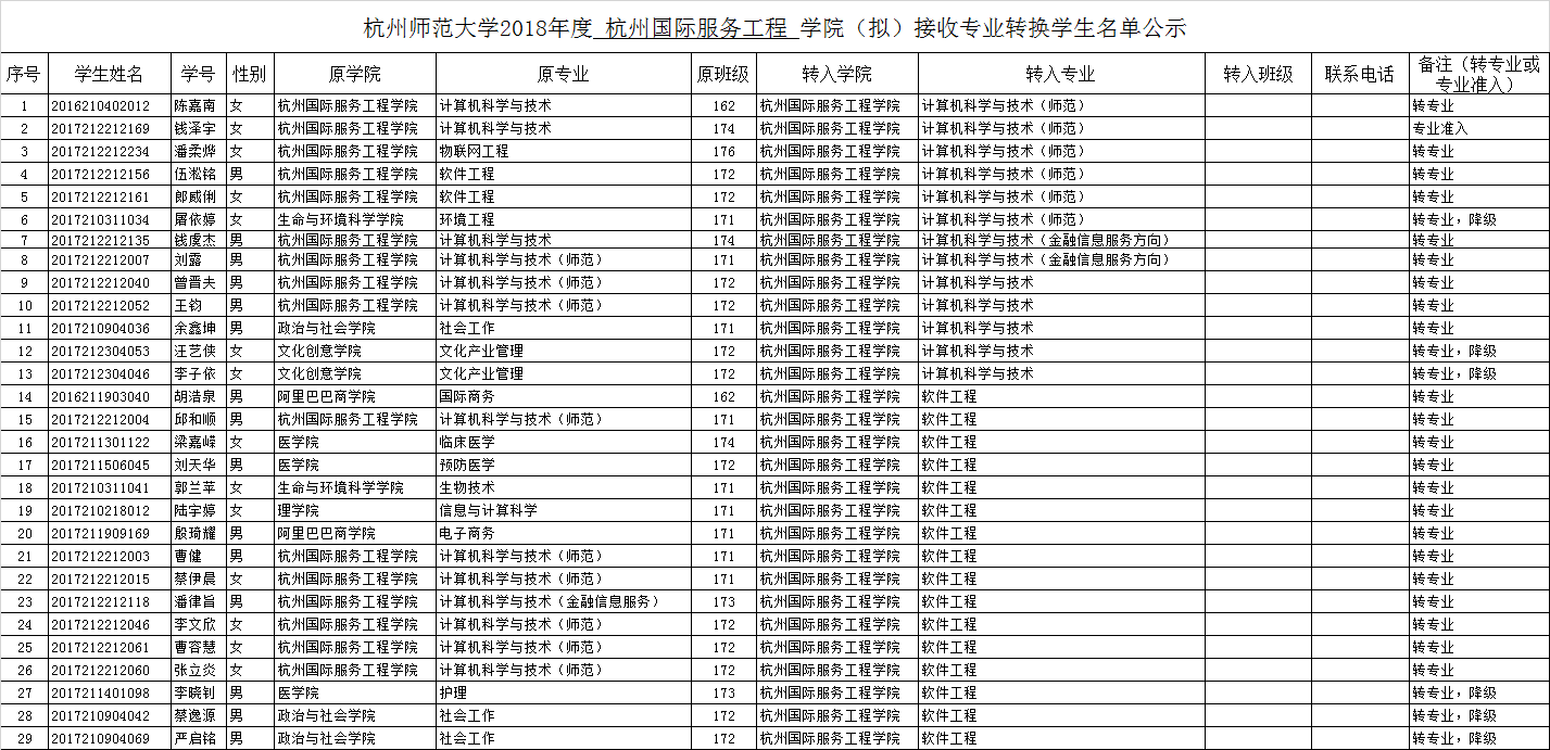 杭州国际服务工程学院2018年度(拟)接收专业转换学生面试结果公示 时间:2018-05-24 16:27:47 文章来源 :教学 浏览量:503 本学院于5月23日组织面试考核组对拟转专业(含专业准入)学生进行了面试,现将面试结果予以公示,公示期至5月27日下午4:20止。 1、申请转入本学院各专业(含院内转)的学生32人,实际参加面试人数31人,1人未到,视为放弃; 2、对31人的面试结果:同意转入的29人(其中降级转入的6人,专业准入1人),不同意转入的2人。 具体情况如下表:2018年度国服学院(拟)接收专业转换学生名单公示