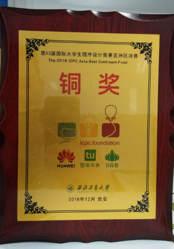 2018年12月16日,第四十三届ACM国际大学生程序设计竞赛亚洲区总决赛(The 2018 ICPC Asia-East Continent Final)在西北工业大学翱翔体育馆拉下帷幕。最终,来自17吃瓜 的“diu”赛队和“biu”赛队荣获铜奖。