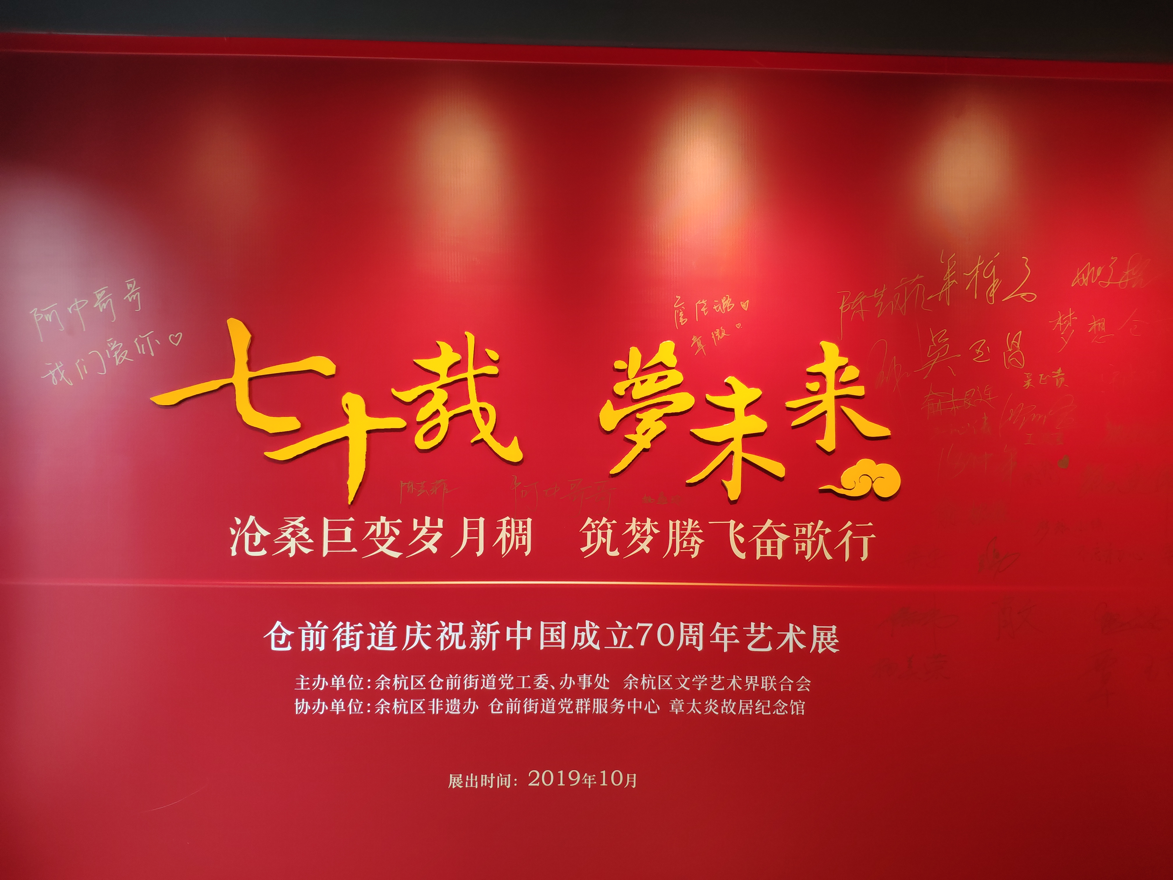 支部党员和新生申请对象一起参观了章太炎故居的基本陈列,通过照片、文物等回顾了这位著名的中国近代民主主义革命家、思想家和国学大师成长和奋斗的经历,深入了解章太炎先生的一生。参观结束后,大家在馆内就“初心”和“使命”进行了讨论和交流。同时,同学们还在故居内观摩了仓前街道党工委和余杭区文学艺术界联合会联合主办的“建国70周年书画展”,作品凝聚了书画家对现实生活的关注与感悟,更集中体现了艺术追求和人文关怀。大家聚精会神地品读着展览作品,并不时与身边同学进行交流。结束时,大家纷纷在展览门口的签名板上留下自己的感悟。