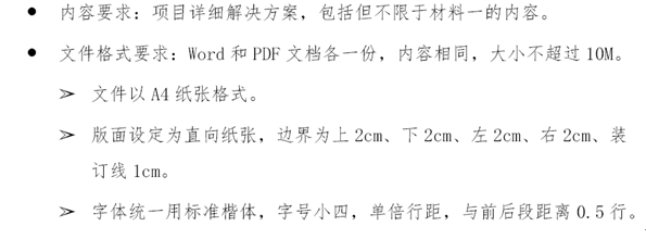 1)项目详细方案文档(必须,包括目标、解决思路、技术可行性、亮点等。尽量不要超过50页,不要大量拷贝往届队伍的材料),具体内容如下图国赛要求所示(其中);2)PPT文档(必须,不超过25页), 3)原型视频。