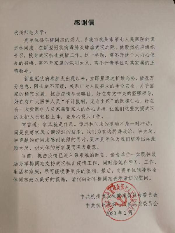 孙军梅老师的家属谭忠林同志驰援武汉的心理援助,并向学校培养出顾大局、识大体的好家属深表敬意。