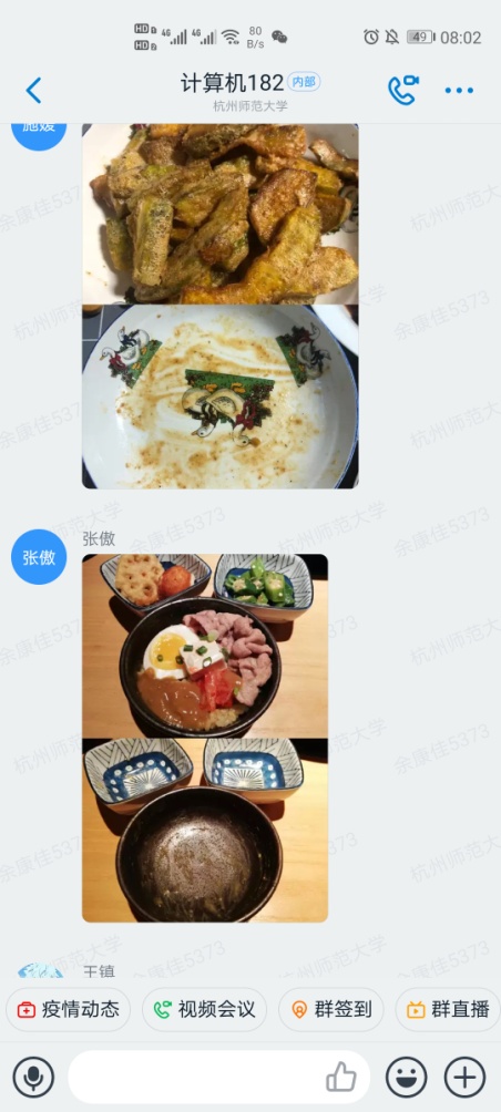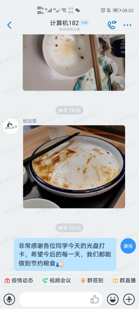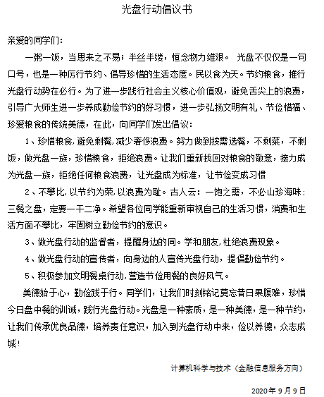 “班长先让大家深入学习贯彻了习近平总书记的重要指示精神,然后向同学们抛出两个问题,让同学们深刻剖析大学生餐饮中存在的浪费行为的原因以及改进举措,同学们的积极性很高,参与度非常高,然后由班长在同学们的回答中整理出一份班级倡议书,得到了同学们的积极响应。次日中午,大家在群里进行光盘行动拍照打卡,用实际行动践行了节约节俭精神。”