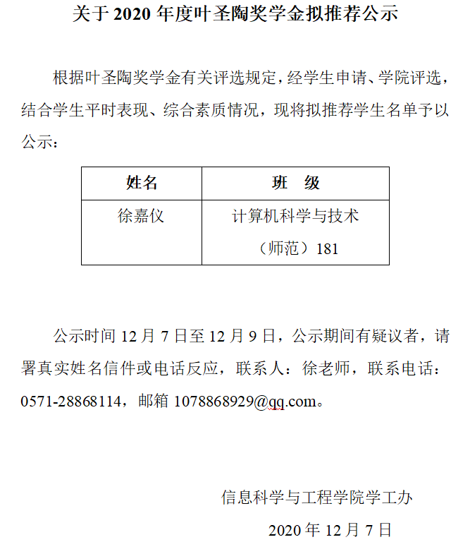 关于信息科学与工程学院2020年度叶圣陶奖学金拟推荐公示