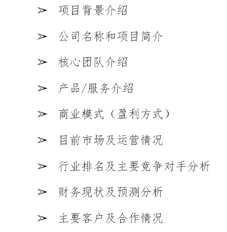 1)商业计划书(文档,必须),2)商业计划书PPT(必须),3)项目知识产权证明(可选)等。商业计划书PPT内容参考国赛要求,如下图所示: