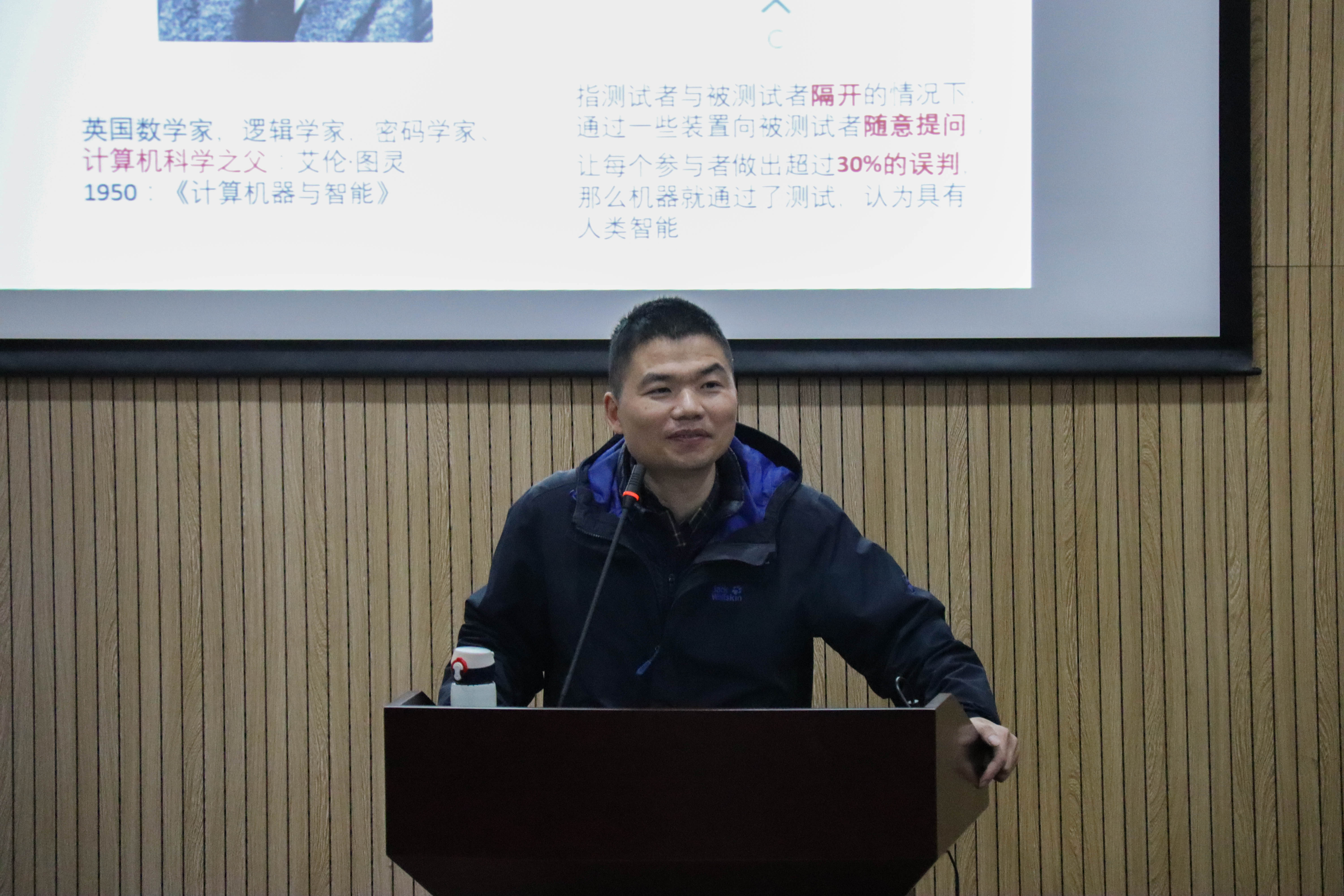 讲座伊始,单振宇老师着眼于“人工智能的发展历史”,详细介绍了计算机科学之父图灵的图灵测试。图灵测试重在检验机器的思考能力,是人工智能哲学的重要组成部分。随后,单老师与同学们深入探讨“理解商业逻辑,当好合格甲方”的话题。他举例了1997年的人机对战-国际象棋以及如今的人机对战-围棋,细致阐述了人机对战背后蕴含的商业逻辑,便于受众有利理解各方需求。同时,单老师还谈及了“数据挖掘”这一概念,数据挖掘是指从大量的数据中通过算法搜索得出隐藏信息的过程,并通过有趣的“啤酒与尿布”数据分析告诉大家数据挖掘的重要性。