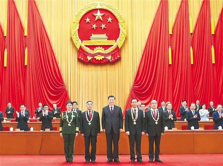 2020年9月8日,在雄壮的《向祖国英雄致敬》乐曲声中,“共和国勋章”获得者钟南山、“人民英雄”国家荣誉称号获得者张伯礼、张定宇、陈薇先后走上主席台,由国家主席习近平一一颁授勋章奖章,并同他们亲切握手、表示祝贺。随后,4位国家勋章和国家荣誉称号获得者受邀到主席台就座,全场响起一阵阵热烈的掌声。