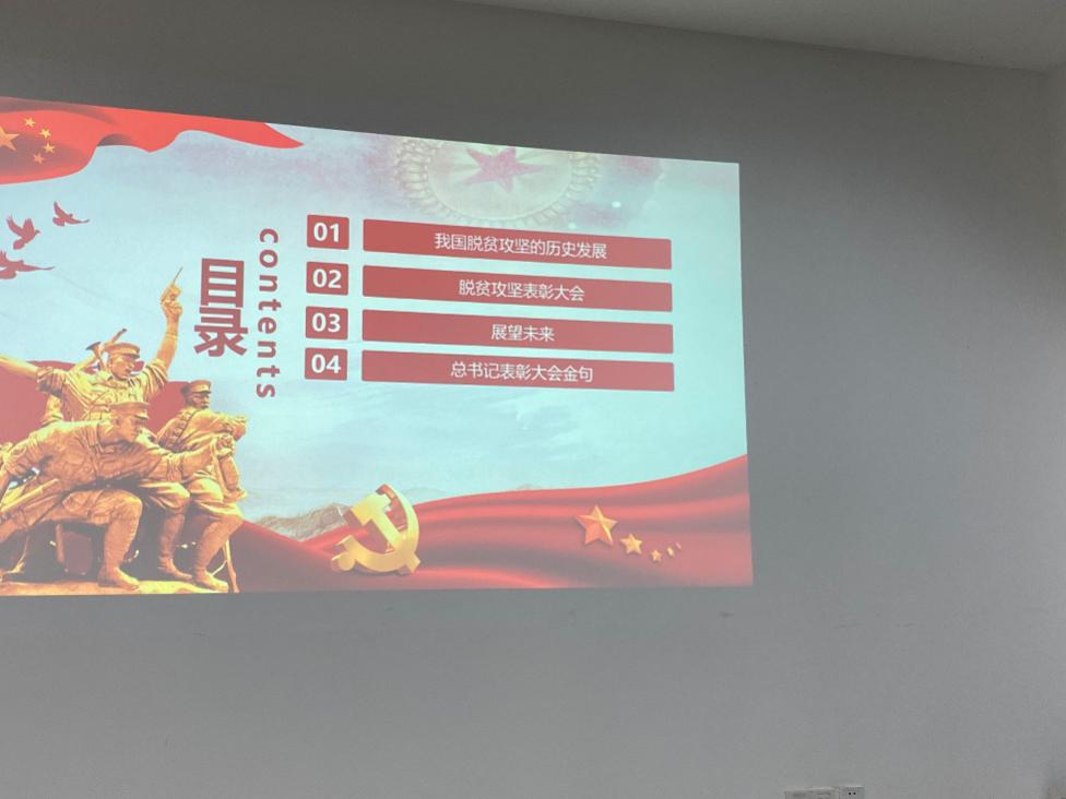 期间,大家还一起观看了时政微纪录中的关于脱贫攻坚战的一小段视频,里面是党和国家对贫困人口切切实实的帮扶,是国家一步一步强盛的历程。党和国家领导还颁发了脱贫攻坚战的先进集体,鼓励全国人民一起打赢这场战争。