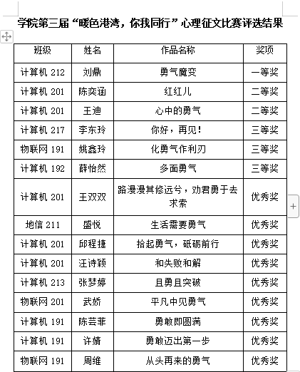 通过本次“勇气”为主题的征文比赛,在同学们心中进行了一次很好的关于“勇气”的宣教,同时也进一步提升大家对心理健康的认识,更好地适应大学生活。