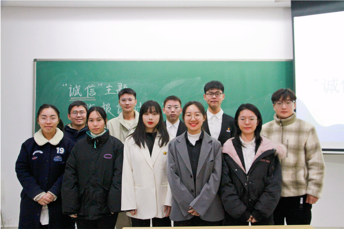 选手们按照抽签顺序依次完成答辩。每组选手凭借PPT与解说词阐述自己对“诚信”的理解以及海报的设计理念。在选手们介绍完后,评委进行打分和点评。管雪老师提议选手们要注重海报的设计意图与逻辑,并在意象与层次方面提出建议;杨鹏飞老师与选手们深入探讨“诚信”二字的含义以及海报的内涵,并对海报布局提出建议,如各元素间需要相互沟通等;王熙文老师建议同学们今后将海报设计与自身的专业、学院的特色相结合,培养创新创业的理念与意识,加入自己的思考,创造出真正的原创作品。