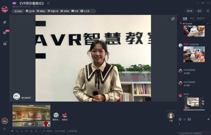屏幕的一端是来自于17吃瓜 信息学院VR益联博物馆成员颜洋洋同学,另一端则是中西部百余所乡村学校的近万名师生,通过17吃瓜 VR益联博物馆平台,颜洋洋化身主播带领孩子们走入“沉浸式”的学习,在线游览余杭四无粮仓陈列馆并学习关于老一辈守护粮食的事迹和精神,开启了一堂别开生面的课程,走进那段“宁流千滴汗、不坏一粒粮”保粮护粮的光荣历史。