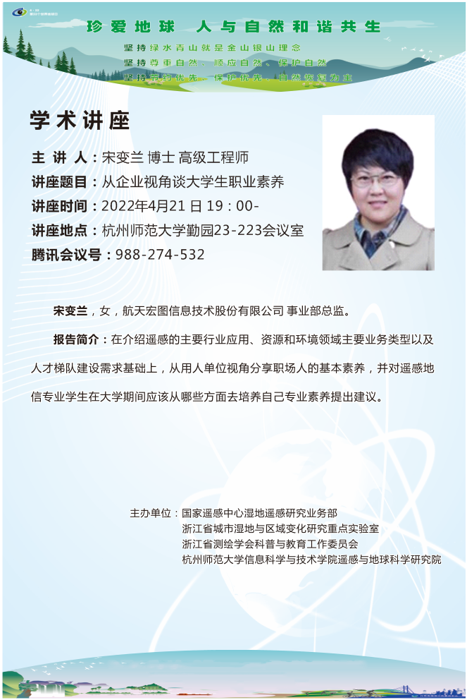 IT讲坛2022年第14期-从企业视角谈大学生职业素养 时间:2022-04-21 10:59:05 文章来源 :学科 浏览量:23 航天宏图信息技术股份有限公司 宋变兰总监 关于“从企业视角谈大学生职业素养”线上专题讲座开讲,欢迎广大师生参加。观看方法:下载腾讯会议APP或登录网页-点击加入会议-填写会议号:988-274-532点击加入会议即可