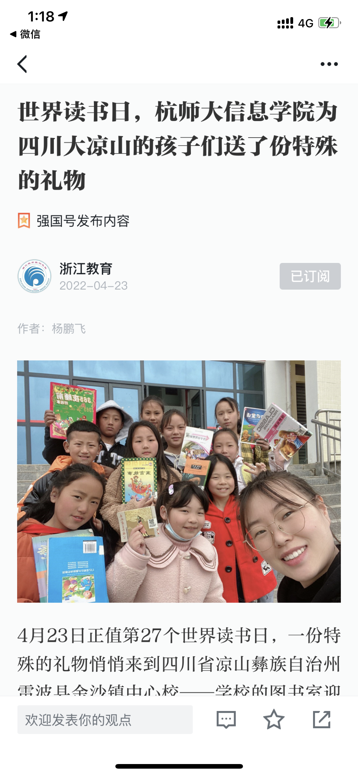 【媒体关注】学习强国:世界读书日,杭师大信息学院为四川大凉山的孩子们送了份特殊的礼物
