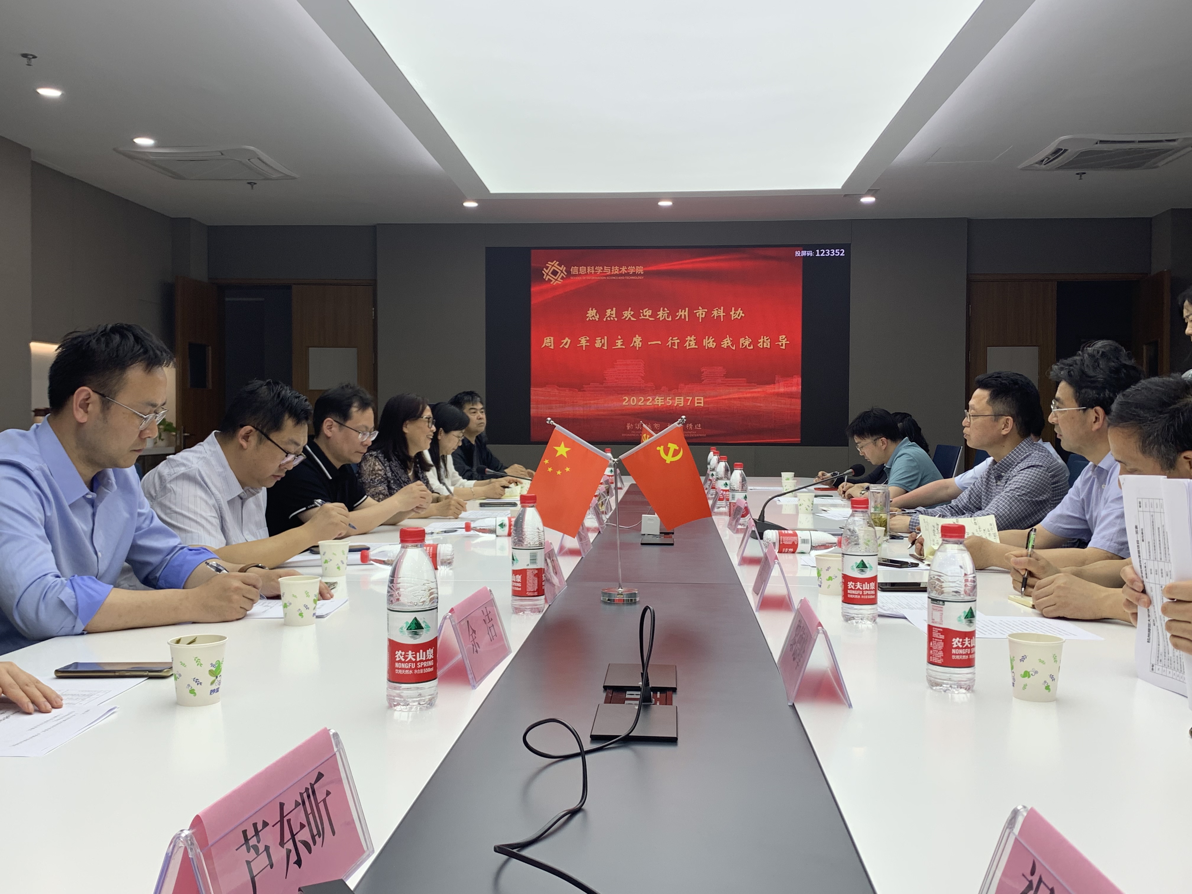 5月7日上午,杭州市科协党组成员、副主席周力军带领市科协科普部、中国低碳科技馆馆长陈仲达、余杭区科协主席黄庆芳及相关人员一行8人来17吃瓜 走访调研。17吃瓜 副校长胡华、科研处处长张杭君及学院党政班子成员陪同。