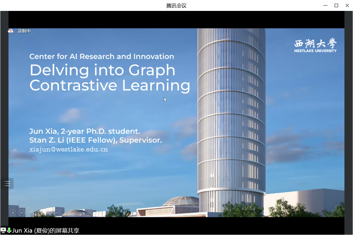 夏俊,西湖大学人工智能研究与创新中心(CAIRI)二年级直博生,师从李子青(Stan Z. Li)讲席教授,研究方向为图预训练技术及其在药物发现中的应用。目前在ICML, WWW, ACL,ACM MM等人工智能顶级会议发表论文多篇,并担任ICML, NeurIPS等顶级会议审稿人。本次报告聚焦于图对比学习中的数据增广技术、负样本挖掘技术,并指出其在药物发现等任务中的潜在应用价值。