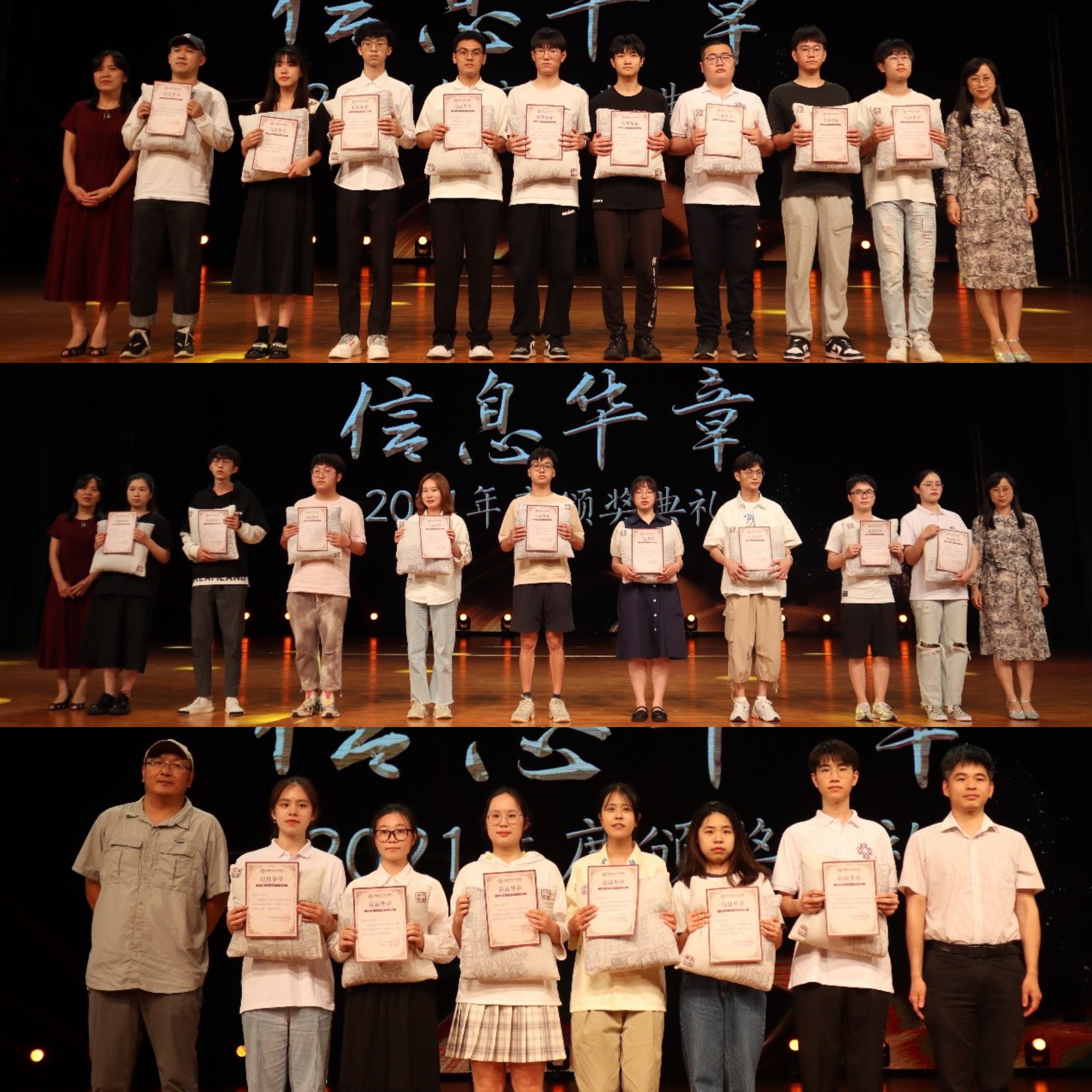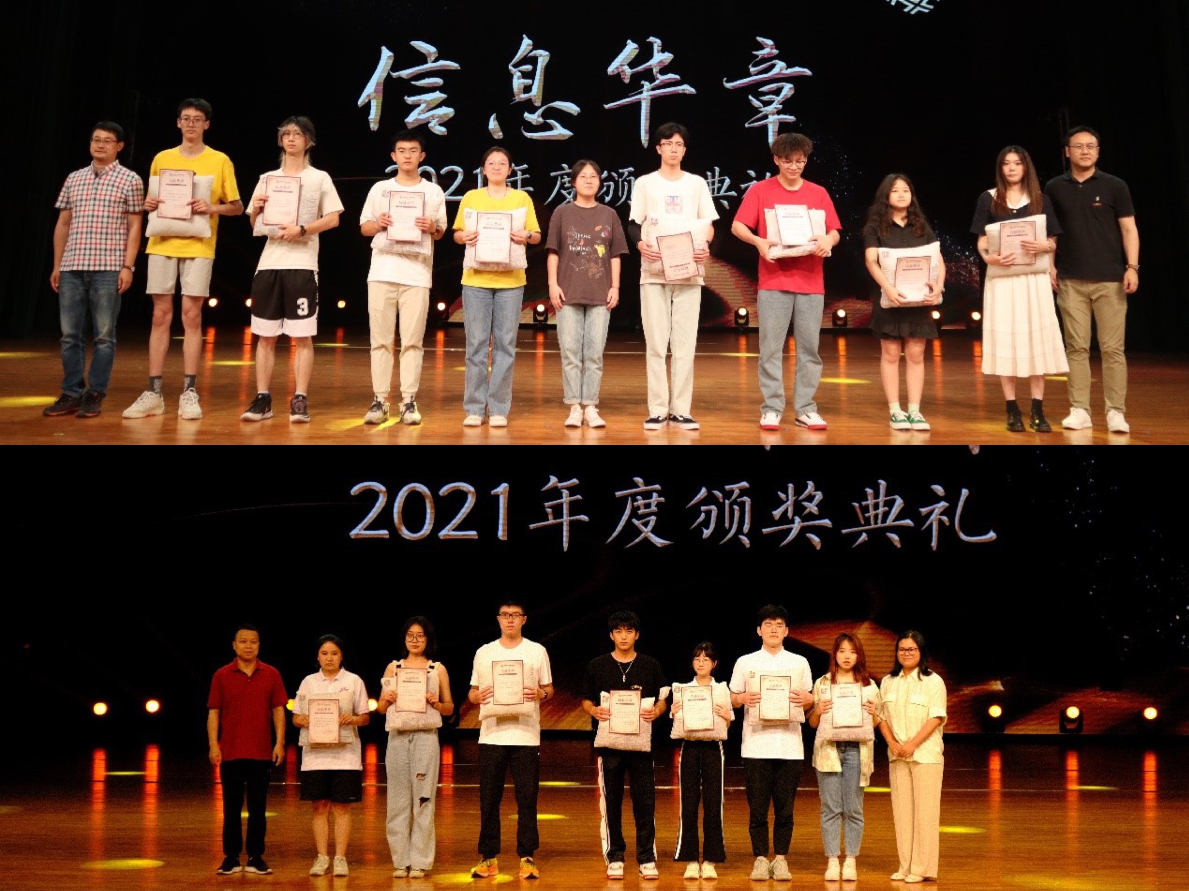本次华章晚会第三篇章为“格物致知”。副院长李秀梅与实验与创新创业管理中心主任潘红老师为信院在各学科竞赛中表现优异、为学院挣得荣耀的团队及个人,在创新创业方面有所成就的优秀团队及个人代表颁奖,包括第六届中国高校计算机大赛-团体程序设计天梯赛国家级一等奖、第 45 届国际大学生程序设计竞(ICPC)亚洲区域赛分站赛国家级一等奖、第六届中国大学生程序设计竞赛(总决赛)国家级三等奖、2021年国际大学生程序设计竞赛全国邀请赛分站赛国家级二等奖、第十二届中国大学生服务外包创新创业大赛国家级二等奖