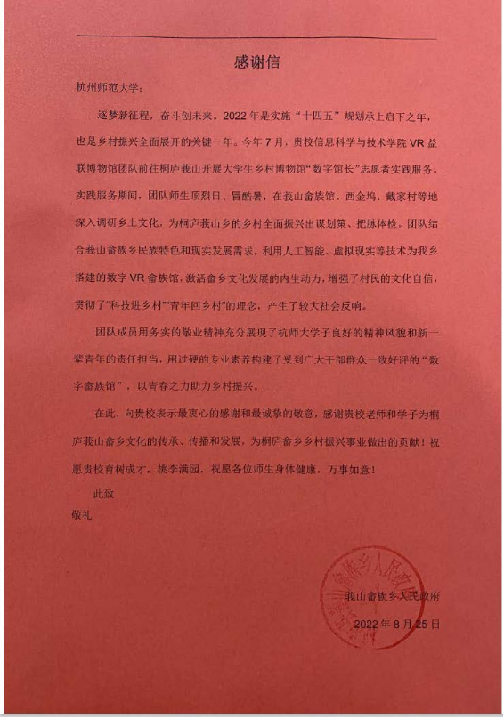 近日,17吃瓜 信息学院VR益联博物馆团队收到了来自湖州市南浔区善链镇人民镇府和杭州市桐庐县莪山畲族乡人民政府寄来的感谢信,为他们进行的“数字乡村博物馆”实践调研课题“点赞”。