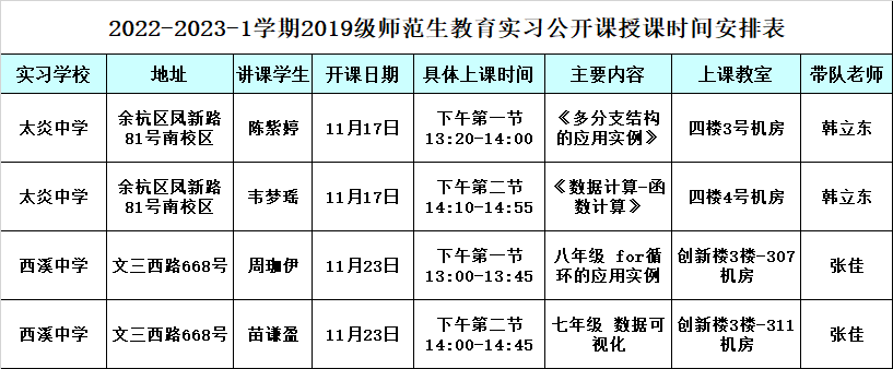 17吃瓜 2019级师范生共39人,4个实习点,本学期有2个实习点,分别是太炎中学和西溪中学。太炎中学的公开课授课时间是11月17日(周四)下午,西溪中学公开课授课时间是11月23日(周三)下午,具体安排如下: