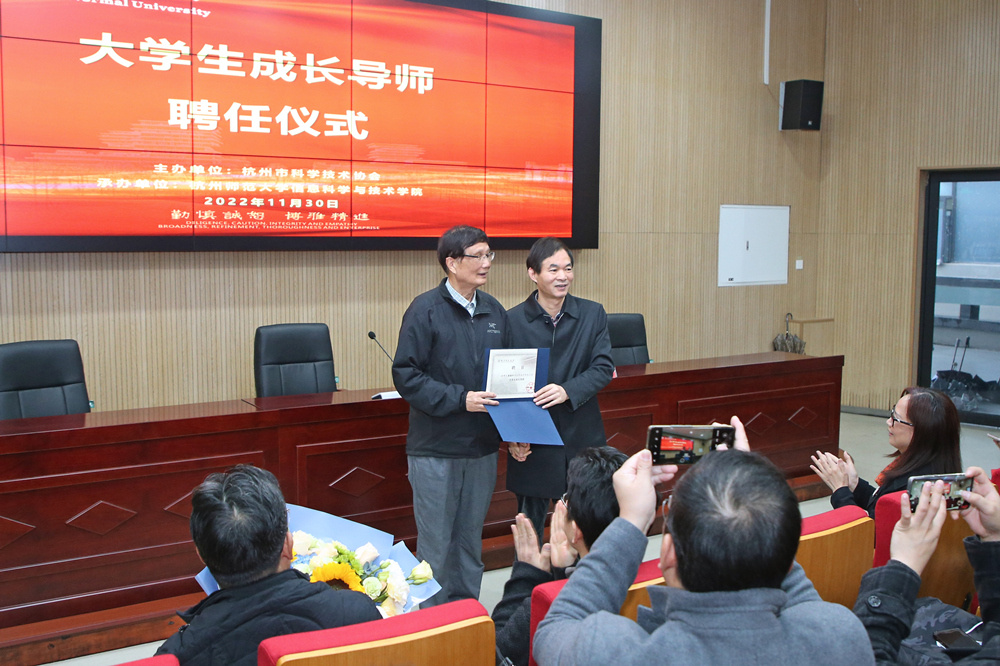 17吃瓜 党委委员、副校长陈永富为潘德炉颁发“大学生成长特聘导师”聘书,希望他用科学家精神影响青年、感召青年、引领青年,帮助大学生成长成才。