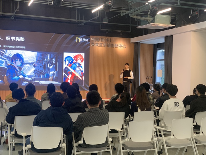 无界内容生态中心负责人赵杰诚在本次活动中为来访师生做了关于AIGC的实用介绍。他表示,设定绘图外形、参考性格、出图尺寸等需求后,仅需45秒,无界AI即可产出170余张图片,经过筛选后合格率在60%左右。接着,他介绍了无界AI与世界一线的AI技术接轨同步更新的ALGC绘图功能,引起台下同学的赞叹。随后是提问环节,同学们就刚刚参访和讲座过程中产生的一些疑惑积极与赵老师互动。会议结束后,由无界AI运营总监刘猛老师带同学们参观了公司员工的办公环境以及工作氛围,也带同学们参观了公司的其他园区。