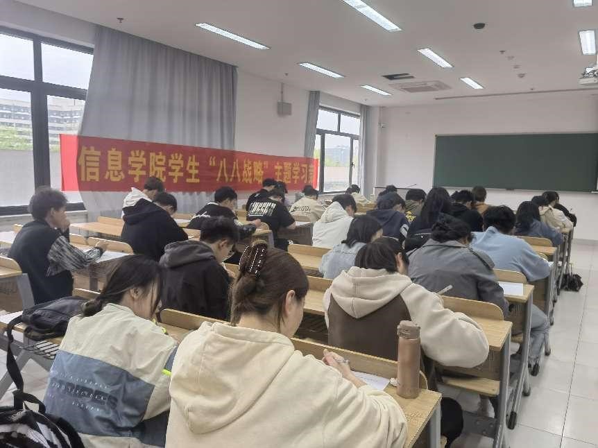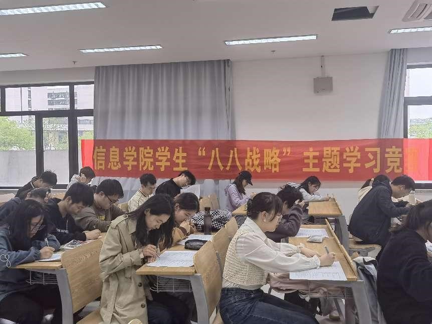 此次知识竞赛活动旨在引领青年学生坚定理想信念、加强理论修养,把忠实践行“八八战略”与学思践悟习近平新时代中国特色社会主义思想贯通起来,坚定理想信念,筑牢精神之基,厚植爱国情怀,矢志不渝跟党走,以实现中华民族伟大复兴为己任。本次竞赛形式为线下答题,题型分为单选题、多选题和判断题。本次参赛的五十余名同学来自信息学院均为各个班级的学生干部。他们在班级积极开展学习“八八战略”的主题学习活动,在学院掀起一股学习热潮。