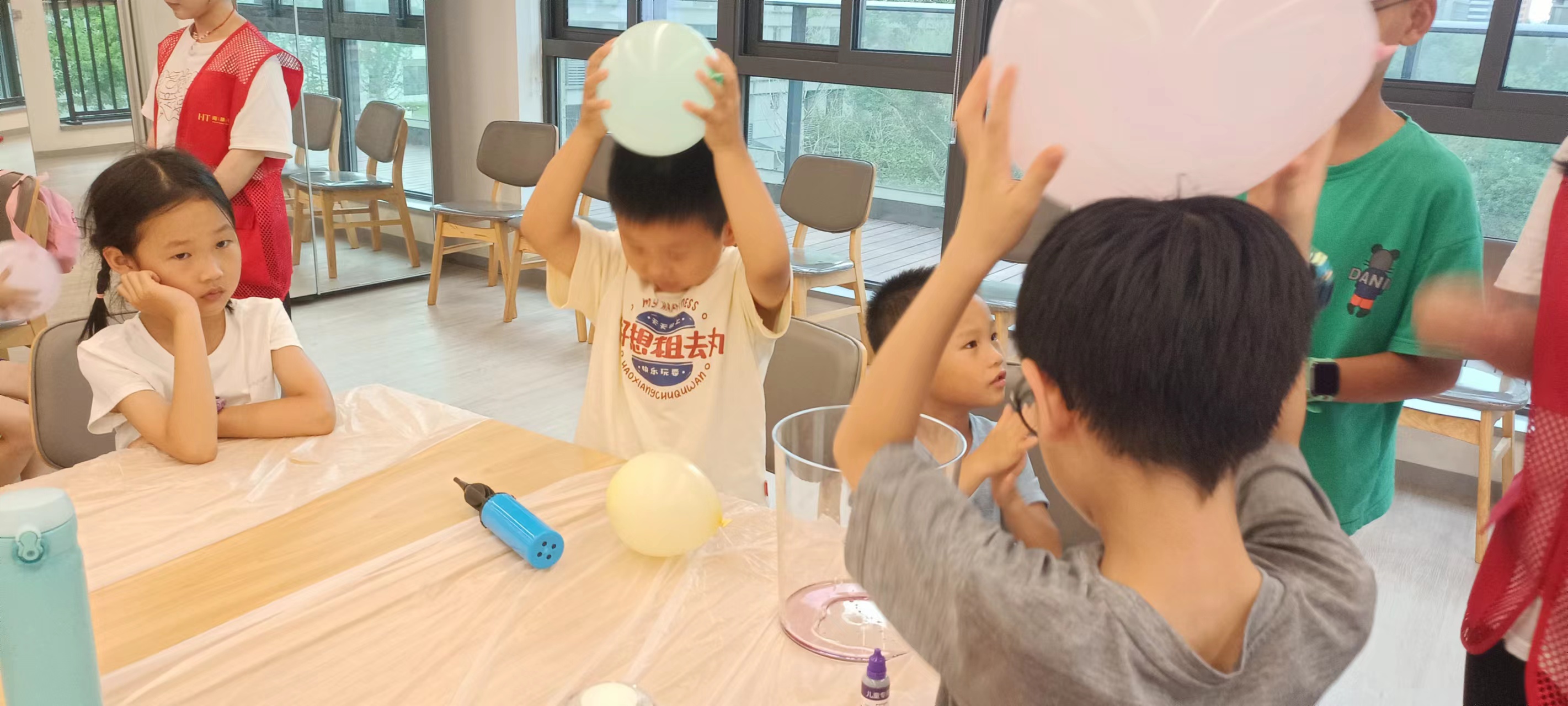 现场,小老师们向小朋友们介绍流星是怎么形成的,并带领小朋友们开展流星雨的形成实验,用气球表示地球,加了色素的水表示流星,摩擦过头发的气球带有的静电表示地球磁场,观察带有静电的气球是否吸引小水珠。