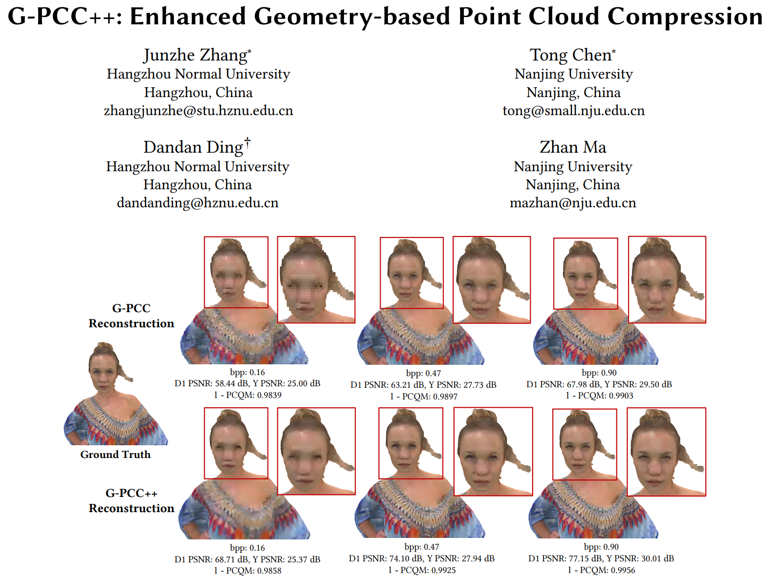 MPEG G-PCC点云压缩标准专为点云有损编码而开发,以实现互联网上的沉浸式服务。然而,有损G-PCC引入了几何和属性信息的叠加失真,严重影响了体验质量。因此,本文提出增强型G-PCC(G-PCC++),以有效解决压缩失真并恢复质量。G-PCC++将增强分为两个阶段:首先增强几何信息,然后将解码的属性映射到增强后的几何体以进行细化。具体地,对于几何增强,首先使用最近邻线性插值来生成更密集的几何表示,然后使用GeoNet进一步生成足够的候选点,并通过概率排序选择来恢复几何信息;对于属性增强,设计了基于最邻近点的高斯距离加权映射来对所有点重新着色,然后由AttNet进行细化以完成最终重建。G-PCC++是第一个同时完成几何和属性增强的方案。大量实验表明了G-PCC++的优越性:相比于G-PCC,在几何D1 (D2)上获得88.24% (80.54%)的增益,在属性Y (YUV)上获得14.64% (13.09%)的增益。此外,当联合考虑几何和属性时,G-PCC++相比G-PCC获得了高达25.58%的性能增益。(图/文 洪东招 丁丹丹)