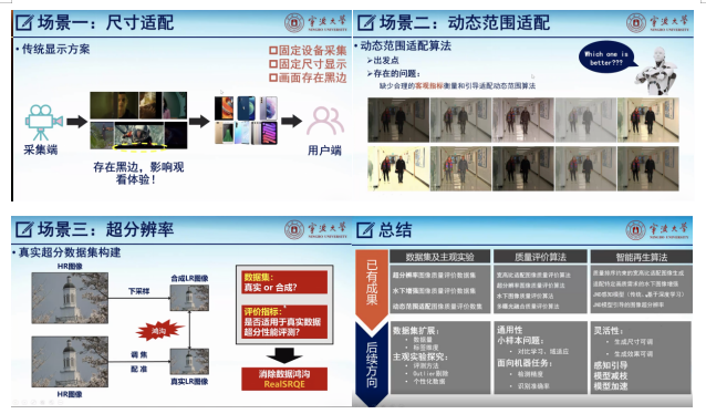 姜老师的讲座内容分成了四个重要部分,包括研究背景、图像智能再生技术、图像适配及质量评价以及图像超分及质量评价。姜老师首先提出,在万物互联的时代,我们面临着海量的图像数据来源以及多样化的显示终端和应用场景。图像智能再生技术成为连接这些需求和人眼感知之间的纽带。此技术不仅仅局限于人脸识别和信息分析,还广泛应用于宽高比调整、超分辨率、姿态迁移、色调映射、虚拟视点绘制、水下图像增强等多个领域。接下来,姜老师系统地介绍了图像适配的场景,包括尺寸适配、动态范围适配和超分辨率等,并详细讨论了各种质量评价算法,如宽高比适配图像质量评价算法、超分辨图像质量评价算法、水下图像质量评价算法、多曝光融合质量评价算法等。这些评价算法融入了数据驱动和深度学习的方法,为研究提供了宝贵的参考。在讲座中,姜老师还分享了现有数据集和算法的成果,并展望了未来的发展方向,使大家能够更好地了解该领域的前沿研究动态。