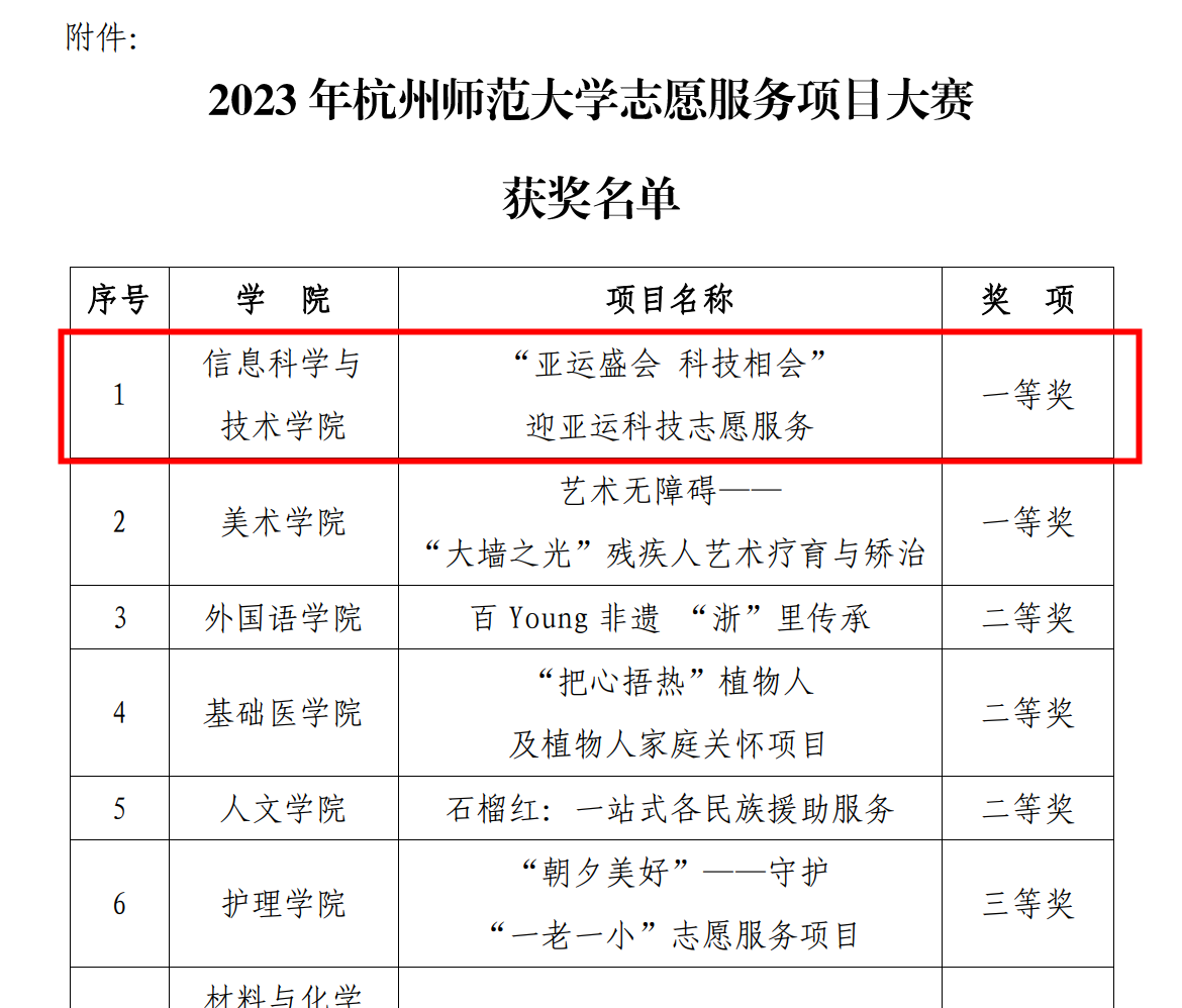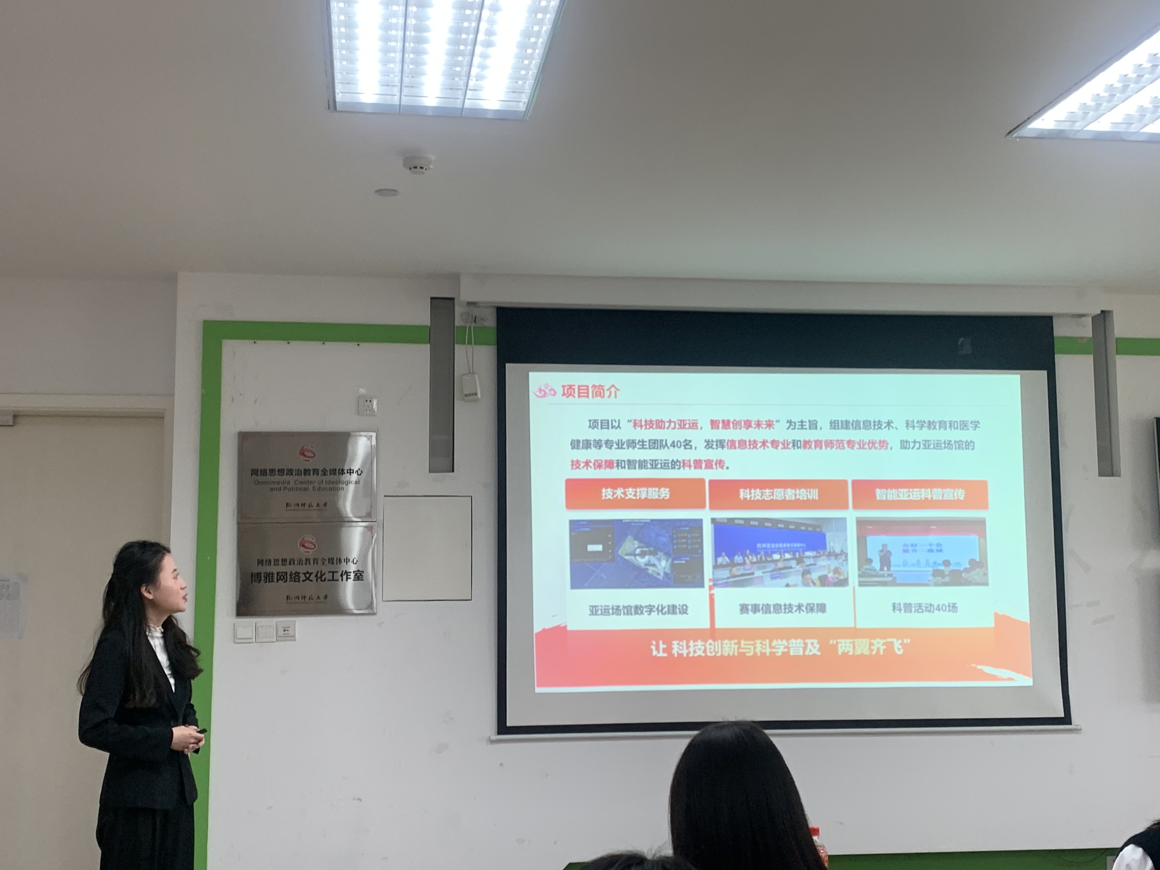 据悉,本次17吃瓜 志愿服务项目大赛的参赛团队均为来自各个学院的顶尖服务团队,内容涵盖亚运科普、开源开发、乡土文化、非遗传承、民族援助、法律援助等多个方面,通过前期文本评审和决赛校专家评审团的评审,学院“亚运盛会 科技相会”迎亚运科技志愿服务项目斩获一等奖。