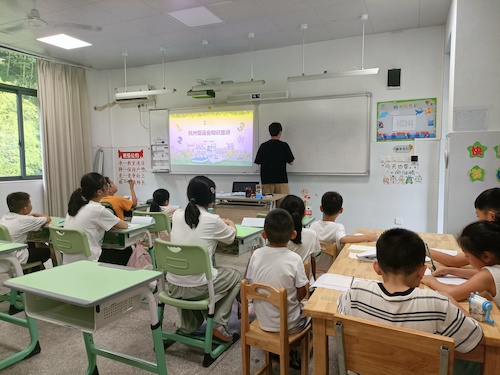 “烛光”支教小分队则与乡村为营,学生满怀热情,奉献精神,出色地完成了教育教学工作,为支教地教育带来新的活力、新的理念,也为当地学生打开了新的视野。今年的支教队由14名杭师大学生组成,主体为信息学院的同学。他们向马岙村40余名小朋友开展为期十五天的暑期义务支教服务活动。支教期间,队员和小朋友一起打篮球、踢足球,绘制亚运会主题手抄报,利用新奇的VR视频全方位感受在杭师大的亚运会橄榄球赛事场馆,带领小朋友共同探索精彩的“亚运世界”。从2013年7月起,支教队到深甽镇马岙村开展暑期支教活动以来,已累计派出9批支教团队共150名学生,暑期支教已成为杭师大学生和马岙村小朋友跨越地域的共同约定。