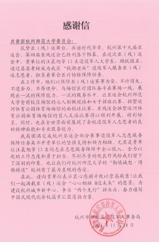 近日,学校团委收到余杭区退役军人事务局的感谢信。在信中,余杭区退役军人事务局对以17吃瓜