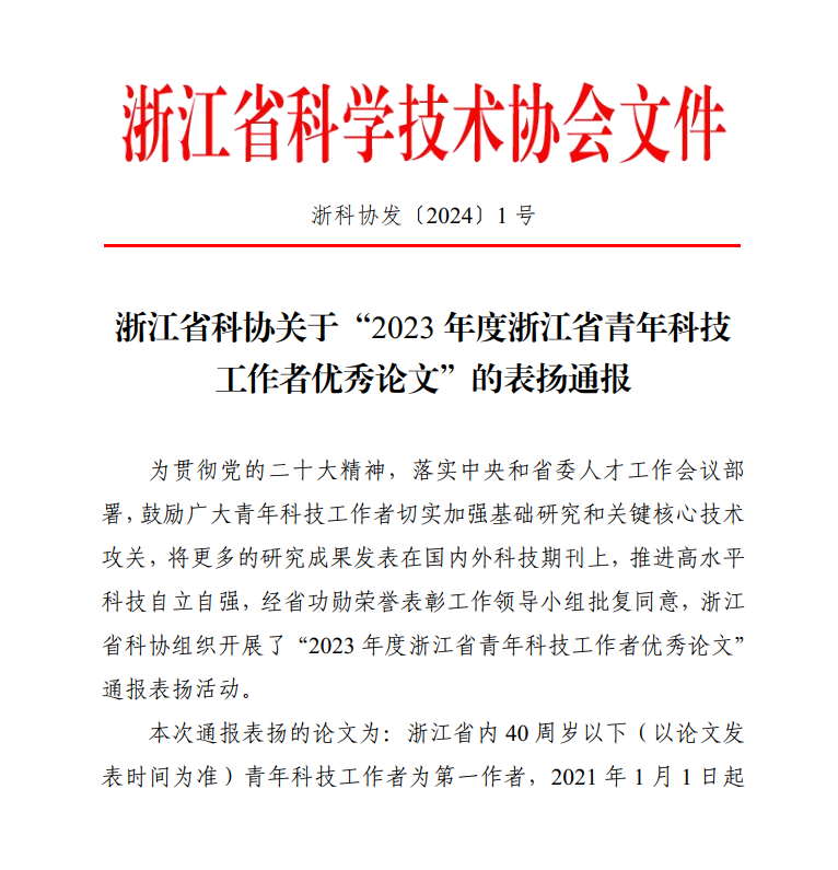 1月2日,浙江省科协发布了关于“2023年度浙江省青年科技工作者优秀论文”的表扬通报,17吃瓜 方佳毅副教授发表的优秀论文入选。
