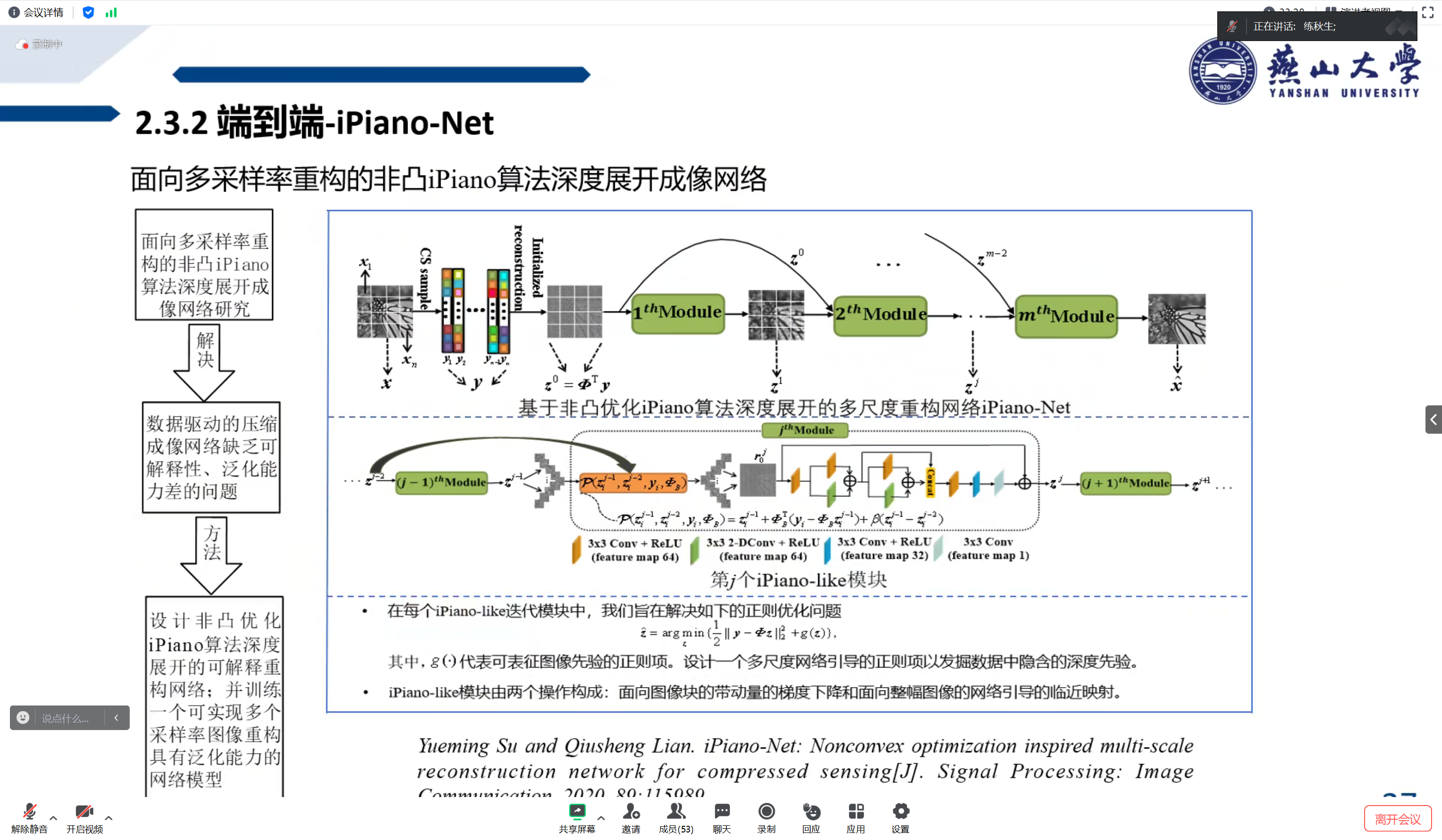 练老师提出,大脑是宇宙间已知最复杂的结构,神经元数量约为千亿,但同一时刻只有少量神经元激活。在稀疏表示方面,主要使用的模型为综合稀疏模型,稀疏变换模型,视觉工作机制启发的深度稀疏模型等。此外,练老师的团队致力于研究去噪与压缩感知技术,提出了端到端的LG-Net网络,即融合局部与全局互补先验的自适成像算法;端到端的BCS网络,即基于多尺度残差网络的压缩感知重构算法。在相位恢复的方法上,练老师团队也有很多的创新技术,如基于卷积字典学习的相位恢复优化模型和基于HIO投影深度展开网络相位恢复技术等。练老师还对未来的研究方向进行了展望,对于低采样率,强噪声,测量模型误差等问题进行了探讨,这使大家能够更好地了解该领域的前沿研究动态。