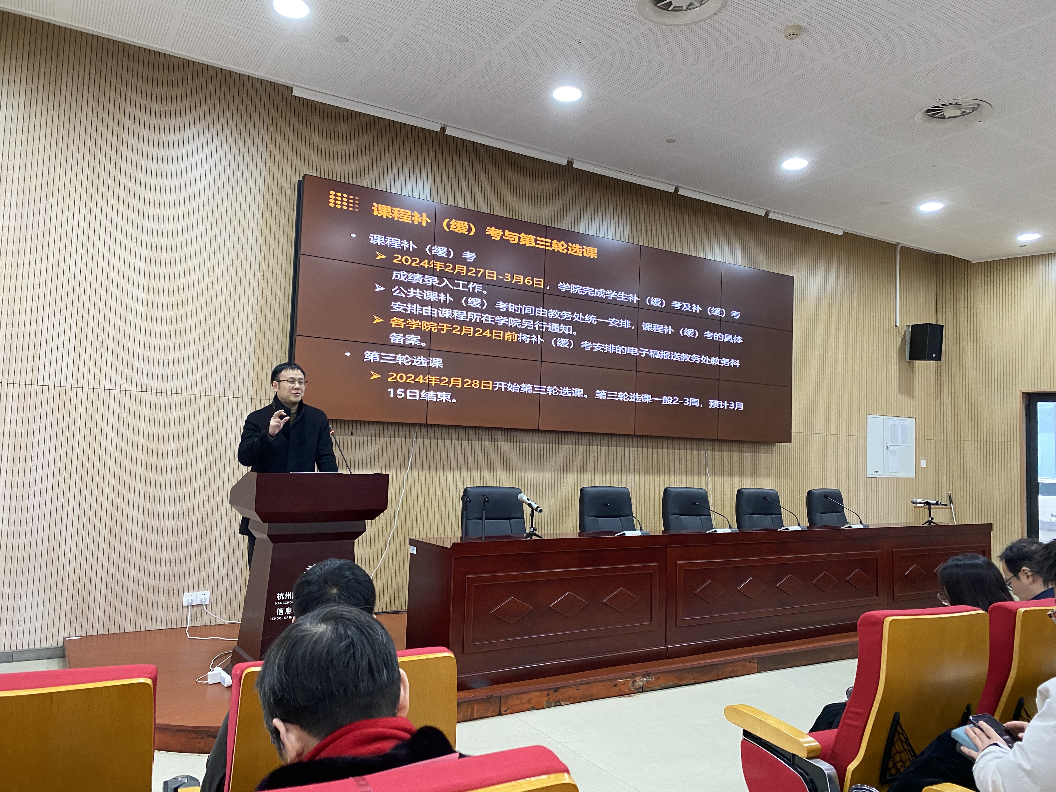 党委委员、副院长姚争为围绕开学初工作安排、本科毕业论文安排、教育教学审核评估作相关工作安排,并就2024年在学院专业建设、课程建设和产教融合(企业助力教育)等重点工作方面进行任务布置。