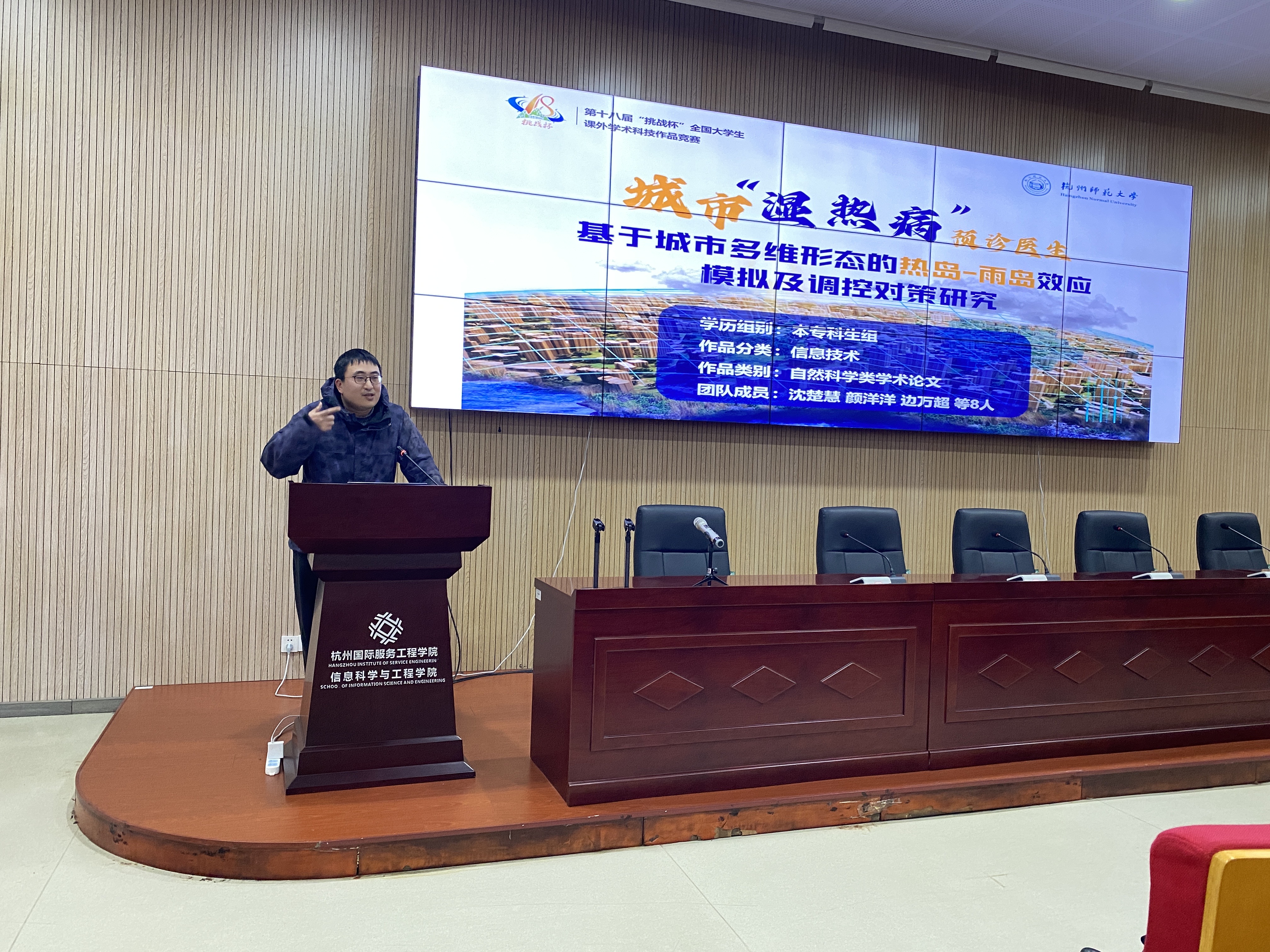 随后,侯浩老师上台分享了他在指导学生参加“挑战杯”全国大学生课外学术科技作品竞赛中的宝贵经验。在2023年10月的第十八届“挑战杯”竞赛中,侯浩老师带领的团队凭借作品《城市“湿热病”预诊医生——基于城市多维形态的热岛-雨岛效应模拟及调控对策研究》荣获了特等奖。他分享了从前期准备到赛事结束的整个过程,包括团队组建、赛事流程、参赛各个阶段的重点内容。他的分享让在场的教师们对如何准备和参与这类竞赛有了更深入的理解,并且从他的经验中获得了许多启示和帮助。