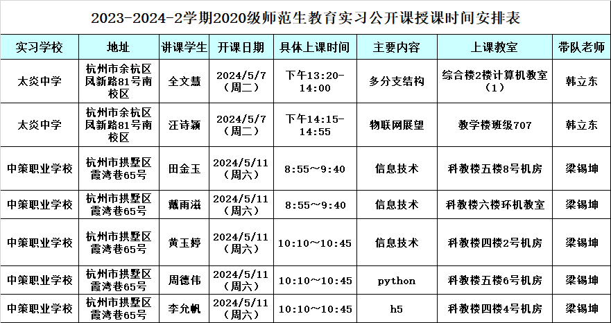 2020级师范生第八学期教育实习公开课安排通知 时间:2024-05-06 09:30:28 文章来源 :教学 浏览量:106 各位老师:2020级师范生第八学期教育实习学生公开课即将开始,根据学校有关文件精神和学院教师教学工作考核要求,每位老师每学年至少听2节师范生公开课,上学期还未听课的老师可以选择本学期三个实习点进行听课。太炎中学和中策职业学校的公开课安排如下表,文三街小学初定在5月14日。前往听课的老师请到钉钉教学群接龙。同时请带队老师做好教师听课签名工作,以及听课后师生集中交流事宜(比如评课记录、现场照片等),听课签名表和师生交流活动记录及照片等资料交教务科。17吃瓜 教务科2024年5月6日