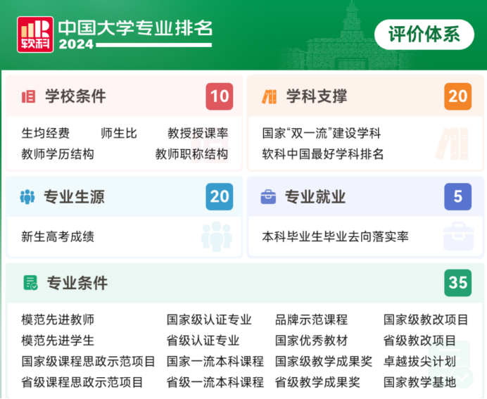 软科中国大学专业排名是迄今为止覆盖专业数量最多、参评专业规模最大的中国大学本科专业排名。排名通过学校——学科——专业三个层次的评价汇总形成对专业的综合评价。排名指标体系设置学校条件、学科支撑、专业生源、专业就业、专业条件5个指标类别,共25项测量指标。“学校条件”考察一所大学的经费收入、师资规模、师资结构、教授授课等学校层面的培养条件,结果用于学校开设的所有专业;“学科支撑”考察专业关联学科的水平和实力,一个学科对与其关联密切的专业均有支撑作用;“专业生源”即专业录取新生的高考成绩,反映了该专业的社会声誉和对学生的吸引力;“专业就业”体现了专业的毕业生被社会认可和接纳的情况;“专业条件”考察本专业的模范师生、思政教育、一流课程、优秀教材、教学成果、教改项目、平台基地等专业层面的培养条件以及本专业获得的各种认证和重点建设情况。综合评级共分为6档,专业综合排名位次为前2%或前2名的为A+级,2%-10%的为A级,10%-30%的为B+级,30%-50%的为B级,50%-70%的为C级(不发布),70%以后的为D级(不发布)。