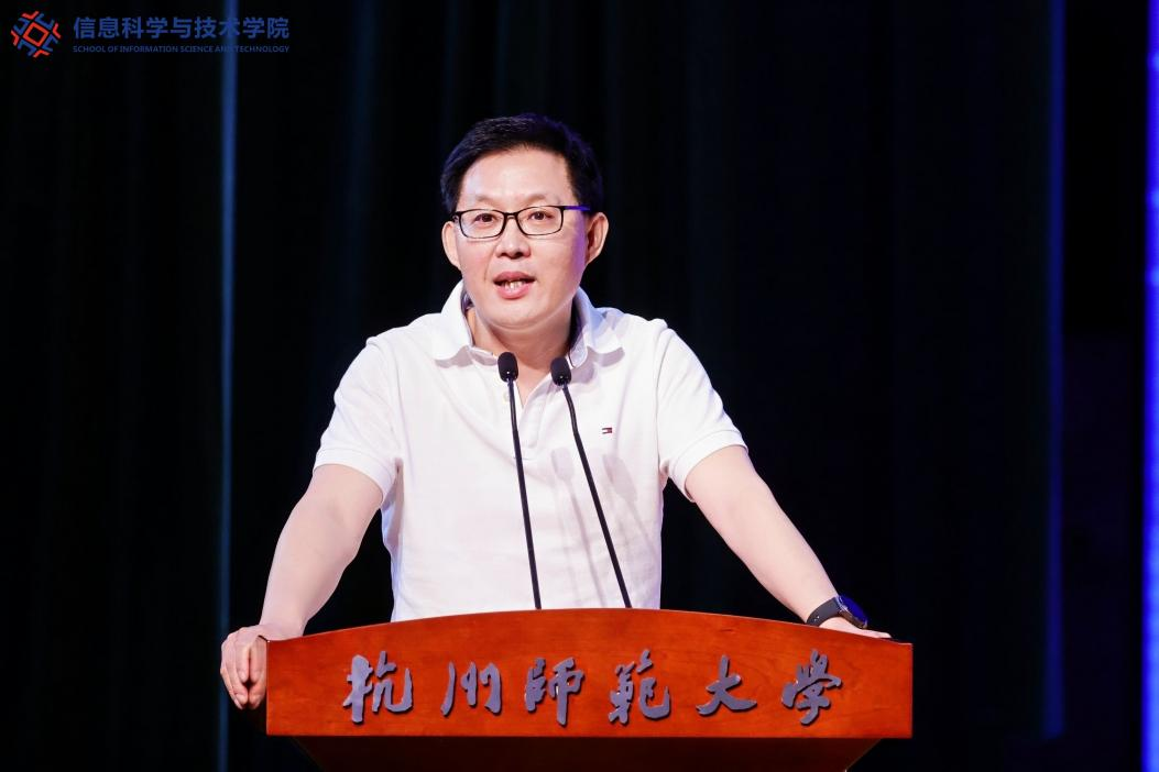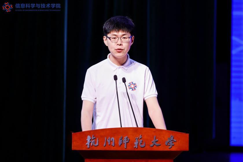 计算机201班符孝天同学代表全体毕业生发言。他深深表达了对即将离开母校的不舍之情与对母校悉心培养的感激,是杭师大信息学院用四年时间教会他“成为什么样的人”与“未来教出怎样的人”。回首一路所历经的磨练与成长,真挚地感谢了一路相助的好友与老师们。正如他所言:我们更要以更广阔的视野、更深邃的思考,去拥抱变化,引领变革。四年大学时光承载了太多回忆,一幕幕场景就像一张张绚丽的剪纸画,串成一部即将谢幕的电影。在离别之际,符孝天同学代表全体毕业生,祝福母校继续熠熠生辉,同学们前途光芒万丈,于顶峰相见!