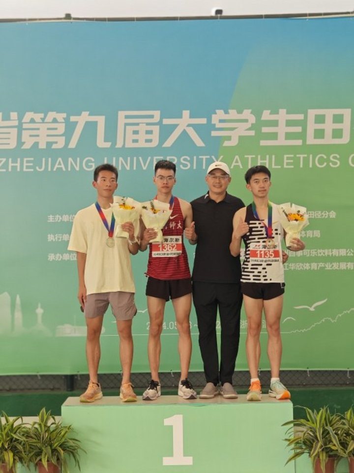 在加入校田径队后,王加淳经历了更加专业的训练,从此也开启了他开挂一样的“夺金”之路。2023年5月,在浙江省第八届大学生田径锦标赛上,他斩获男子甲组800米和1500米冠军,同时打破该项赛事男子甲组1500米纪录,并荣获赛事“优秀运动员”荣誉称号;2023年8月,在第21届全国大学生田径锦标赛上,斩获男子甲组1500米冠军,男子甲组800米季军;2023年11月,在浙江省第十六届大学生运动会上,他荣获男子甲组800米和1500米冠军,同时打破浙江省大学生运动会甲组男子1500米纪录;2023年11月,在17吃瓜 第44届田径运动会上,他先后打破尘封八年之久的男子甲组400米校记录和自己去年校运会上创造的男子甲组800米的校记录,成为学校目前男子甲组400米、800米和1500米校记录的保持者;2024年5月,在浙江省第九届大学生田径锦标赛上,他再次荣获男子甲组800米冠军。在一次次的专业比赛中,他感觉自己得到了质的提升。说到这里,他很想感谢体育学院的黄忠兴老师的教导和照顾,“黄老师一般常驻在仓前校区上课,但是为了帮助我训练,特意将每周两天的课程调来下沙,在他的指导下,我的跑动技术得到了很大的改进,并且训练更加科学了,用更小的跑量换来了更好的体能”。