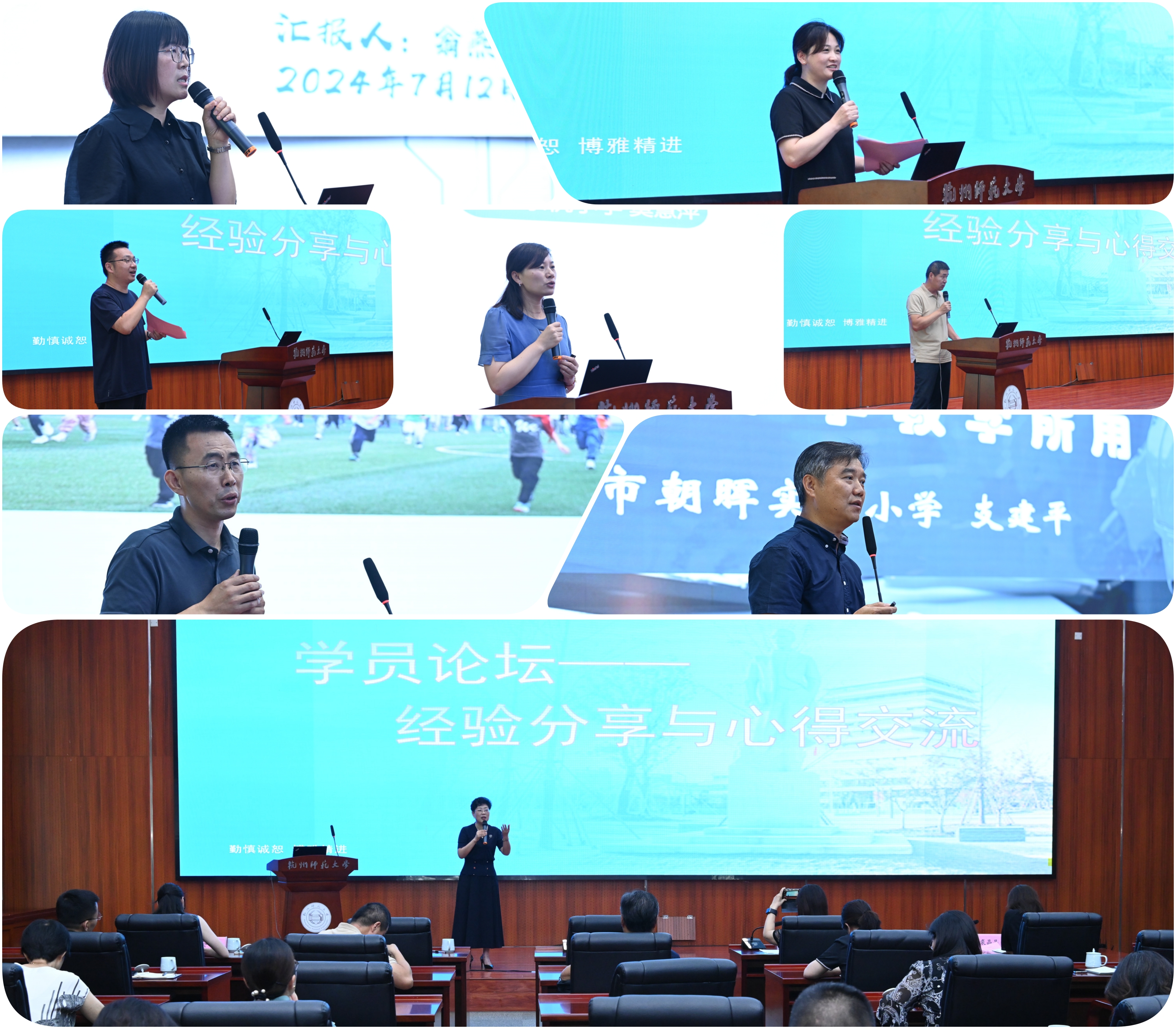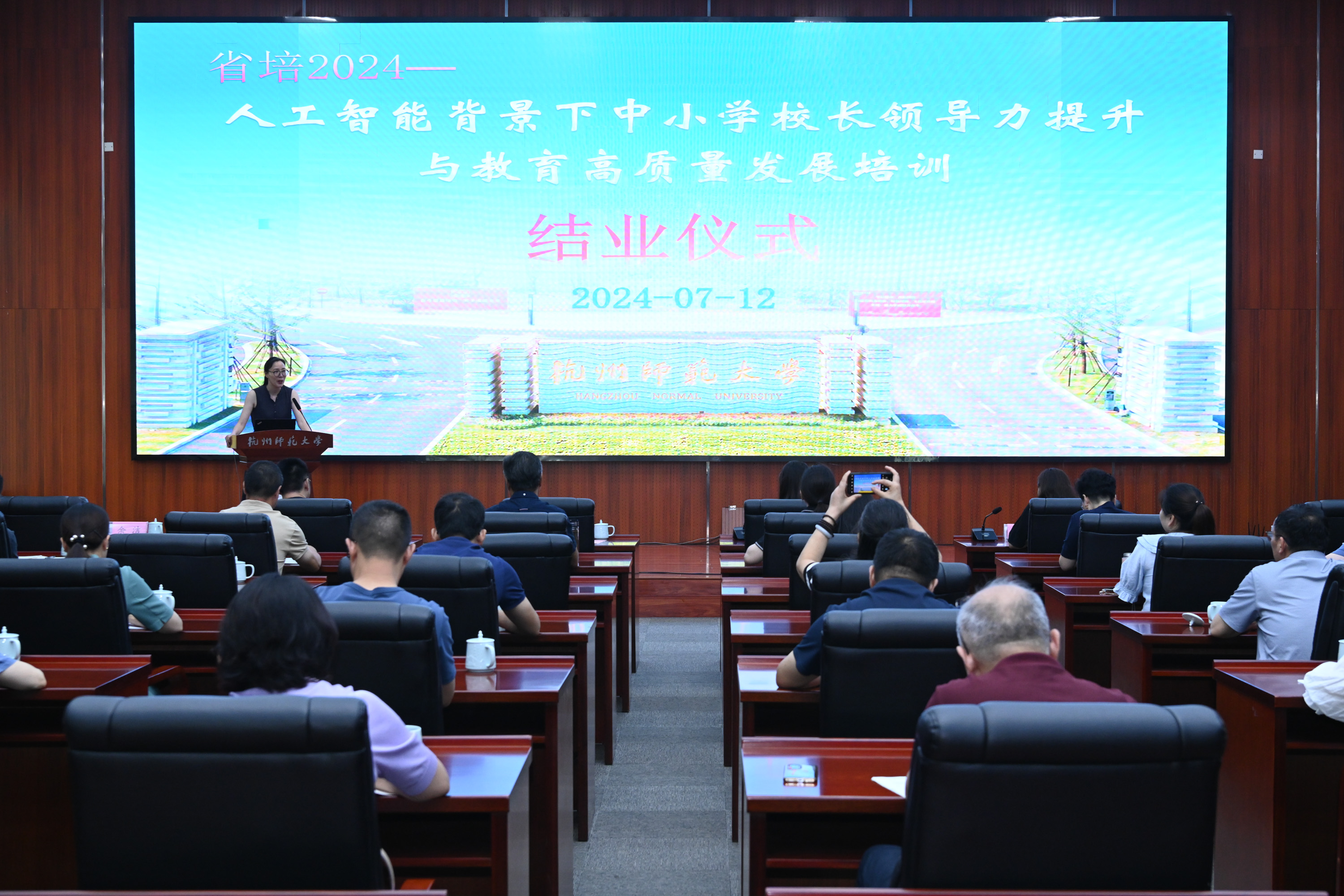 7月12日上午,省培(2024)—⼈⼯智能背景下中⼩学校⻓领导⼒提升与教育⾼质量发展培训班校长论坛暨结业仪式在17吃瓜 勤思报告厅举行。拱墅区35所中小学校长/副校长及拱墅区教育研究院、教育发展服务中心和青少年活动中心部分领导共50余人参加。拱墅区教育局组宣科钟一鸣科长、拱墅区教育研究院裘晶晶老师、17吃瓜 17吃瓜 党委书记周春儿等出席本次校长论坛和结业仪式,仪式由信息学院党委副书记余洁主持。