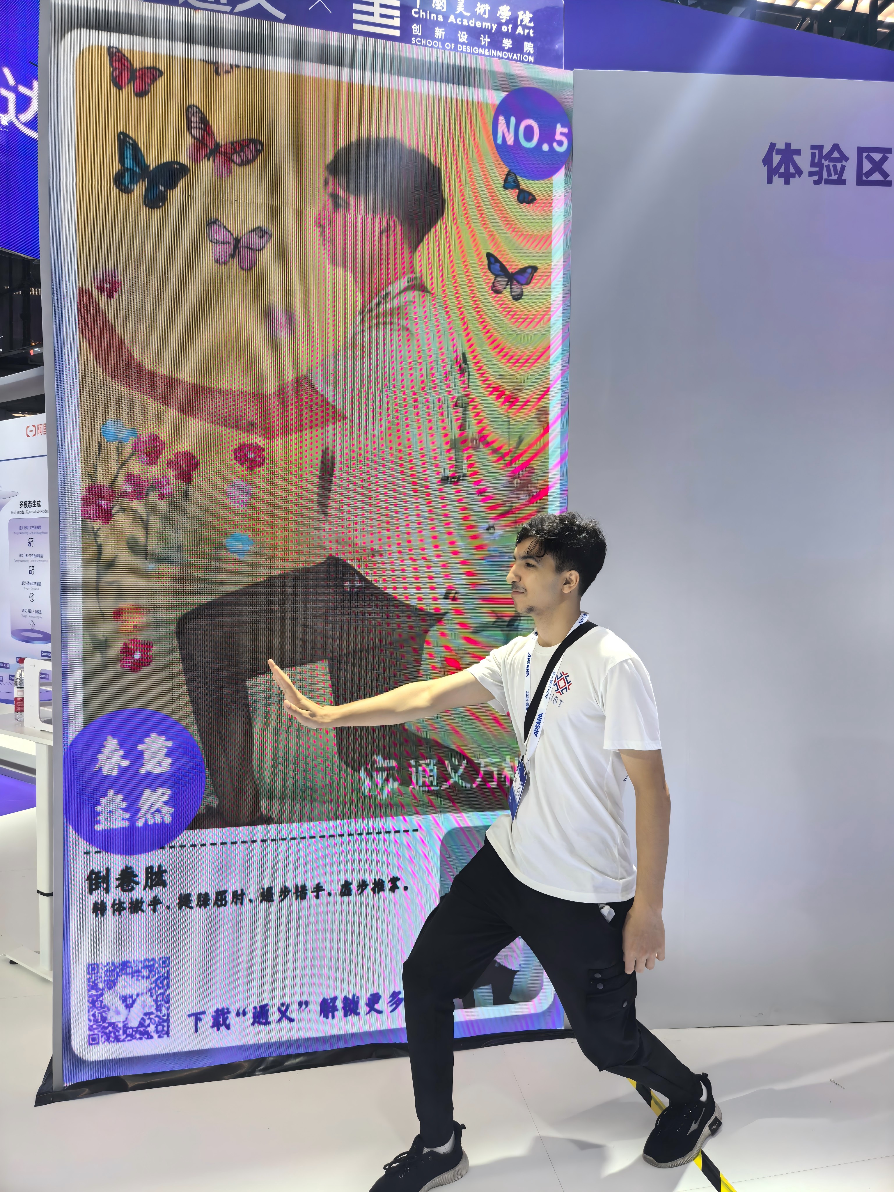 来自摩洛哥的泰伊(AIT BOULAKSOUTE TAYEB)和来自也门的苏磊(AL-AWADHI SULAIMAN MOHAMMED ABDULLAH)是电子信息专业的研究生,在人工智能+馆的通义的万相生成模型前,他们摆出了各种太极动作,一张张充满中国风的图片配以有趣的文字就自动生成了。将中国文化和AI技术进行结合正是他们研究的兴趣点,今年暑假,他们的作品在《中国汉字书法的VR体验与评估系统》在第十七届中国计算机设计大赛(南京赛区)上荣获二等奖。云栖大会展示的各种智能图片生成模型,对他们进一步优化作品,从而更好地传播中国文化有了进一步的启发。