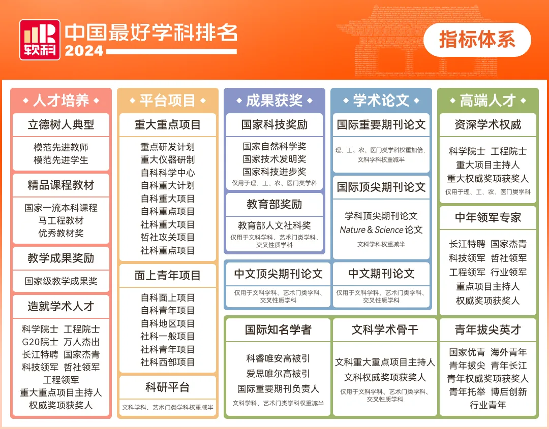 软科中国最好学科排名的指标体系包括人才培养、平台项目、成果获奖、学术论文、高端人才5个指标类别,下设18个指标,共计70余项反映学科竞争力的观测变量。