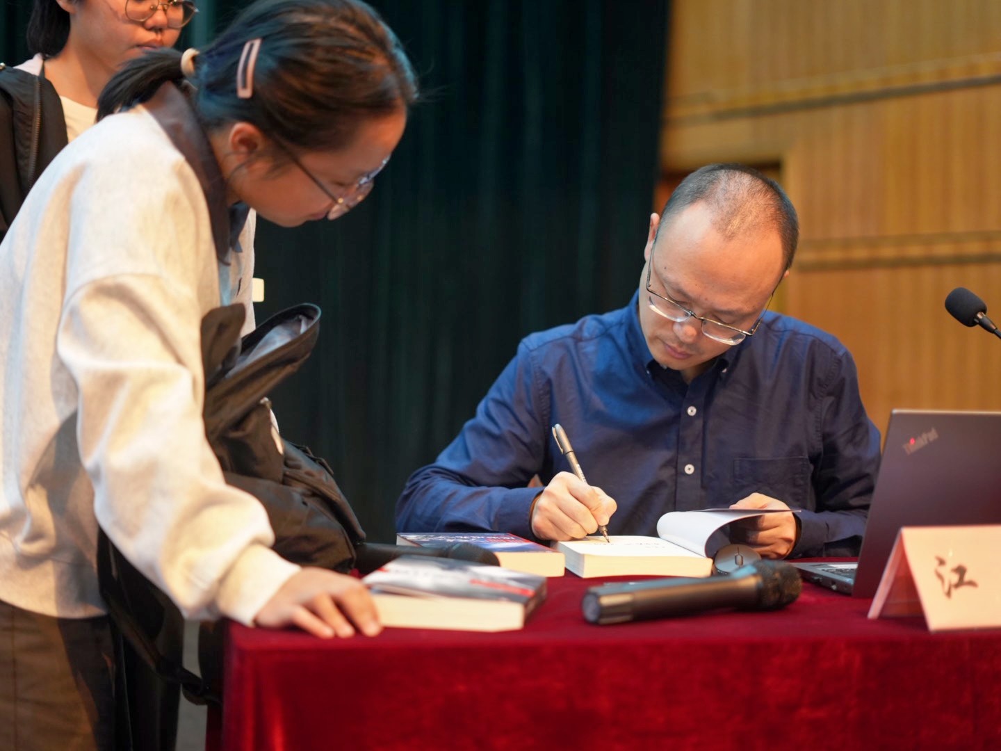 现场,江波还为学生签赠题词“保持好奇,勇于探索”!他希望年轻一代的大学生能把科幻作为思考方法,发现改变现实的力量,共同迎接人工智能时代的辉煌前景。来自物理师范专业的小钱同学从小就怀揣着成为一名科幻作家的梦想。初中时期,她尝试撰写近20万字的作品,但学业压力让她暂时搁置了这个梦想。这次讲座重新点燃了她的激情,尤其是将科幻创作与物理教育相结合的想法。