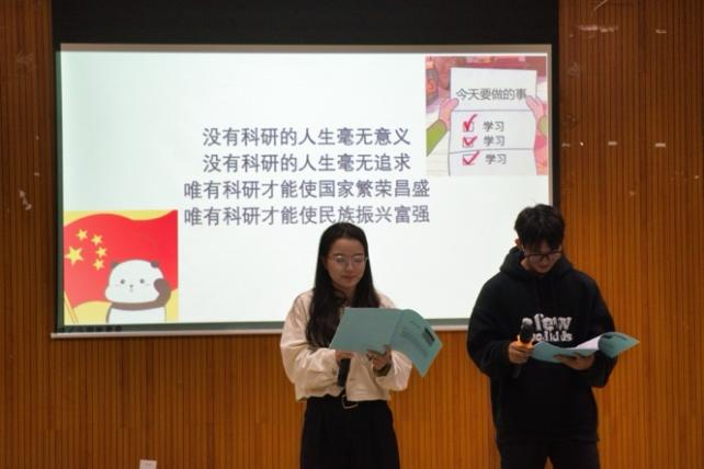 郭伊婷同学与陈鹏宇同学携手带来了朗诵作品《我爱科研》。通过他们幽默诙谐的表达方式,既展现了科研路上的艰辛与挑战,又饱含了对科研事业的热爱与执着。这份情感传递给了在场的每一位观众,激励着大家在科研道路上奋勇前进。