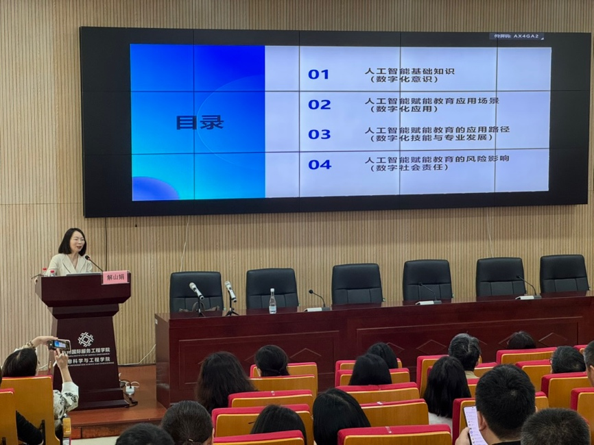 讲座伊始,解山娟副教授从人工智能的基础知识出发,系统梳理了AI技术的发展历程,并聚焦生成式AI的崛起及其对教育模式的深远影响。她将内容分为基础知识、赋能教育应用场景、赋能教育的应用路径以及赋能教育的风险影响四大板块,层层递进展开讲解。