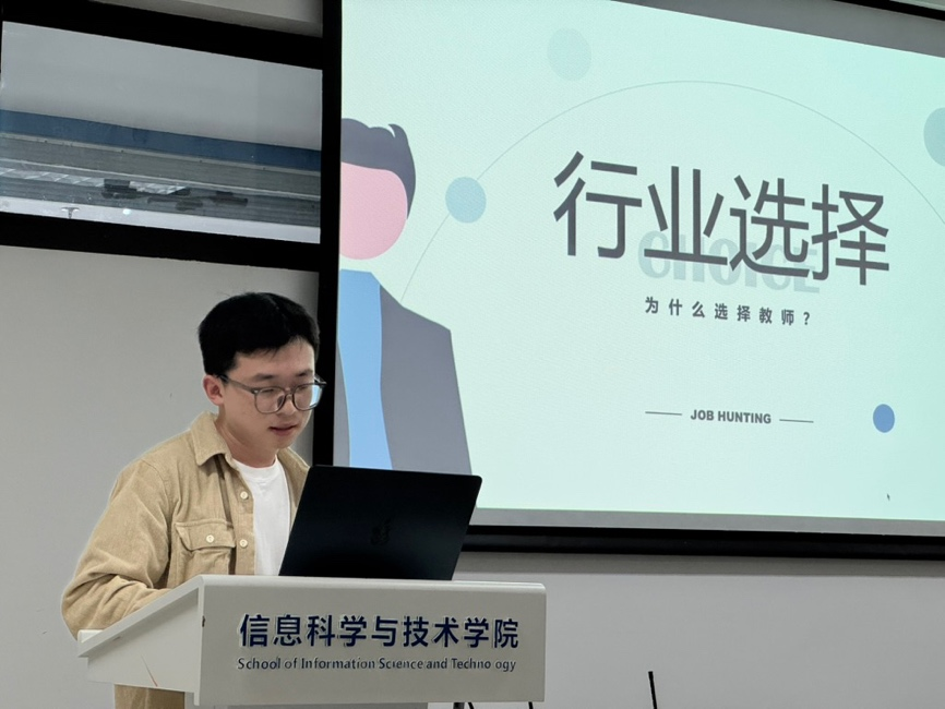 现为宁波市北仑区高中信息技术教师的叶列立学长,从个人简历制作的要点开始,以"五维评估模型"(工作稳定性、专业成长性、环境适配度、资源支持力、待遇竞争力)剖析职业选择逻辑。在考情介绍环节,学长结合杭州市和宁波市不同区的教师编要求,给我们提出了很多宝贵的建议,敦促我们致力于结合学业学习和个人素养的提升,磨砺个人技能。在备考部分,叶学长从教师资格证、笔试要求、试讲准备、结构化面试和实习五个方面进行了细致剖析,并勉励我们“把紧张留到平时备考,把放松留给最终考核”,放平心态,才能正常发挥。