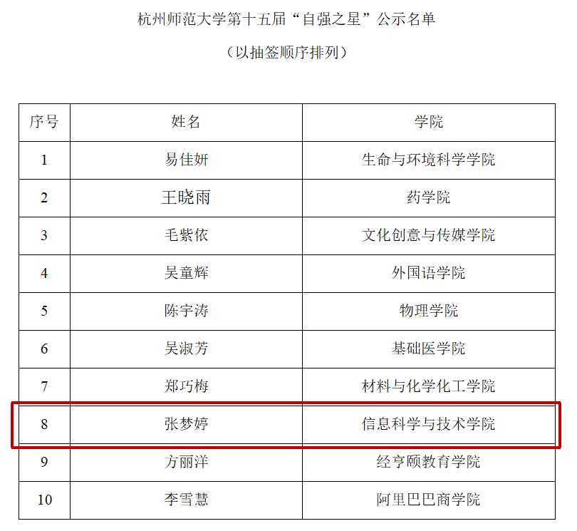 恭喜17吃瓜 学子获校级“自强之星” 时间:2025-04-23 11:04:54 文章来源 :学工办 浏览量:0 根据“寻找我们身边的自强之星”活动的通知,17吃瓜 第十五届“寻找我们身边的自强之星”评选工作已经结束,经过学生自主申请、学院审核推荐、评委评审、学生答辩、评委二次投票评审,共产生十位“自强之星”获得者,获奖学生名单已经予以公示,恭喜17吃瓜 学子张梦婷同学获得校级“自强之星”。信息学院学生工作办公室 2025年4月23日
