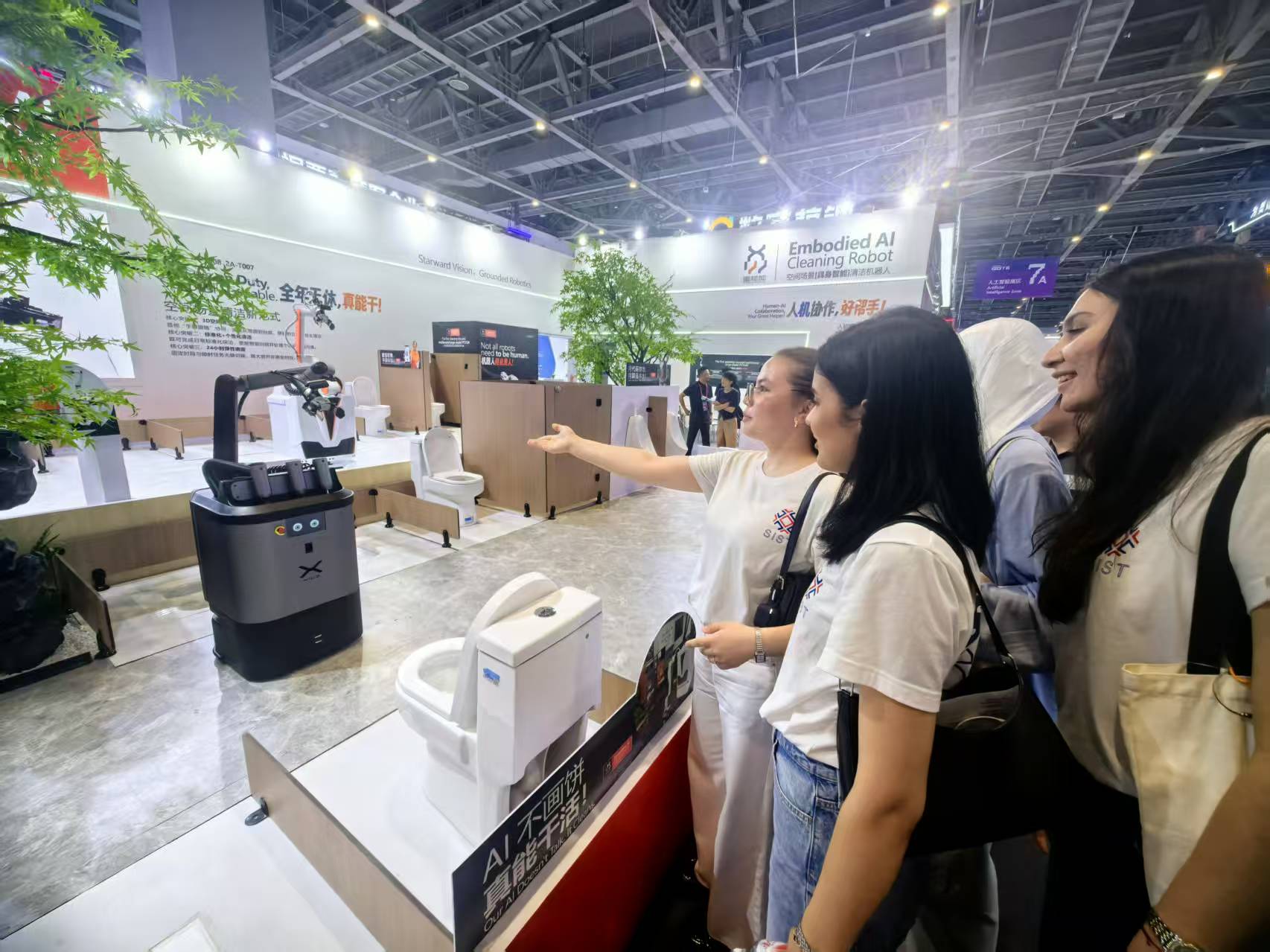 来自土库曼斯坦的太阳(OVEZOVA OGULJEMAL)和伙伴们津津有味地观看配备了激光雷达和灵活机械臂的清洁机器人如何实现扫地、吸尘、烘干、高温清洁于一身的3D立体清洁。
