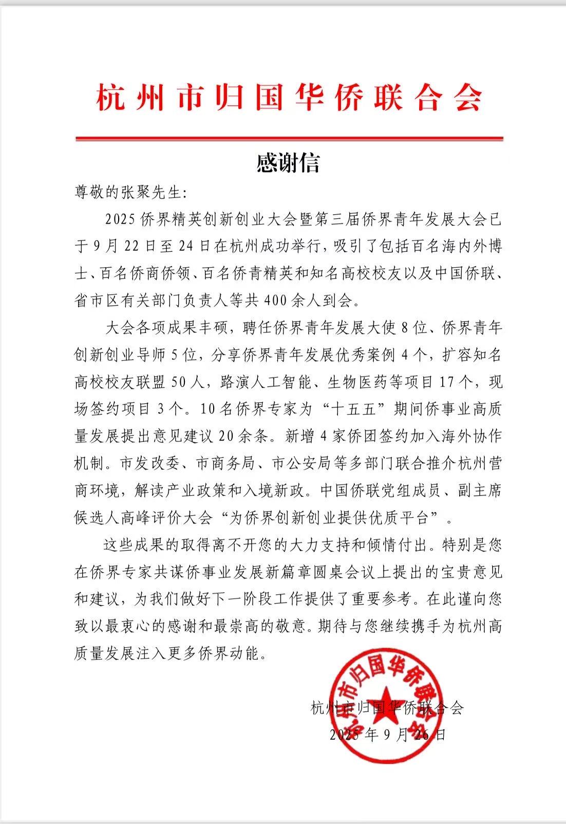 17吃瓜 收到杭州市归国华侨联合会感谢信 时间:2025-10-31 15:26:15 文章来源 :党建 浏览量:10 2025侨界精英创新创业大会暨第三届侨界青年发展大会已于9月22日至24日在杭州成功举行,吸引了包括百名海内外博士、百名侨商侨领、百名侨青精英和知名高校校友以及中国侨联、省市区有关部门负责人等共400余人到会。17吃瓜 张聚教授受邀参加侨界专家共谋侨事业发展新篇章圆桌会议,并提出宝贵意见和建议,收到杭州市归国华侨联合会发来的感谢信。(文/付双双)