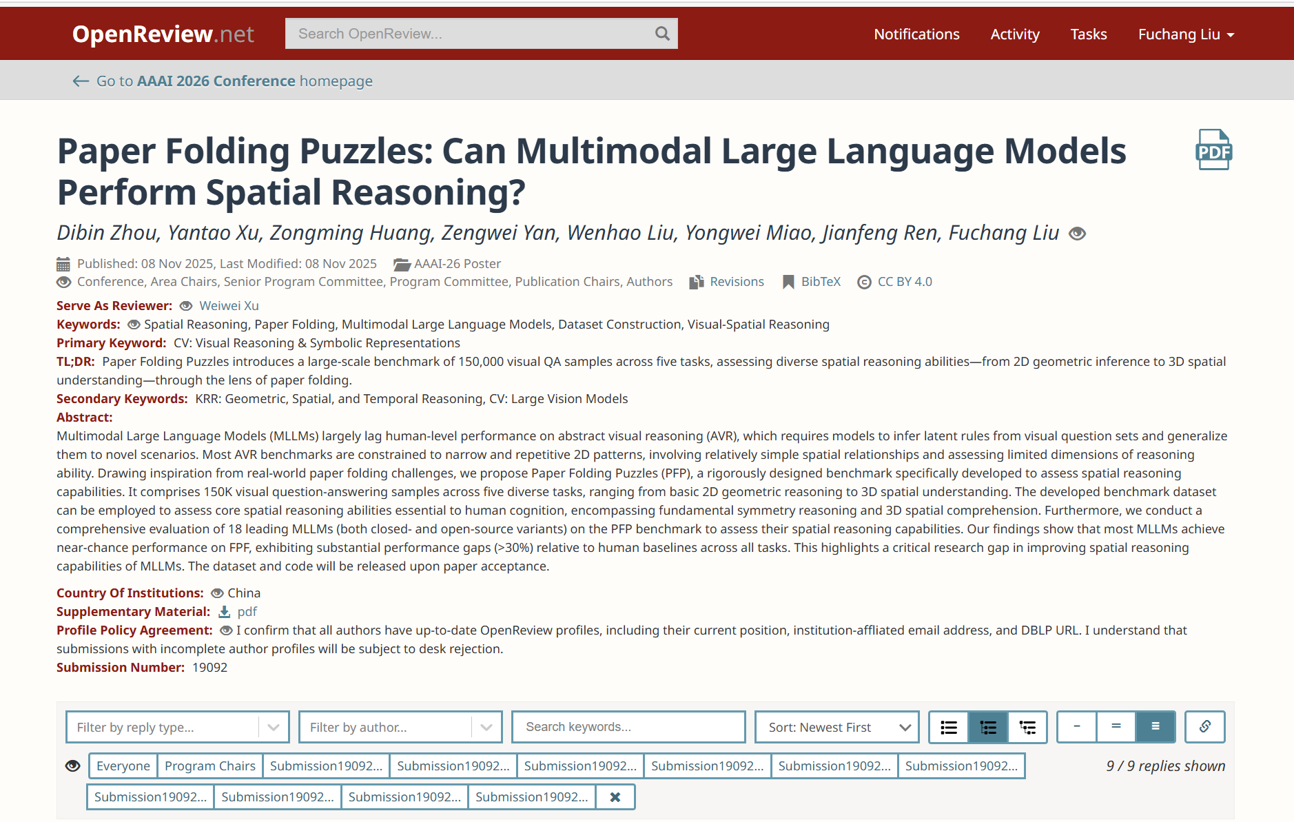 近日,中国计算机学会(CCF)推荐的A类国际学术会议AAAI 2026公布论文接收结果。周迪斌、刘文浩、缪永伟、刘复昌等人提交的论文“Paper Folding Puzzles: Can Multimodal Large Language ModelsPerform Spatial Reasoning?”获得录用。